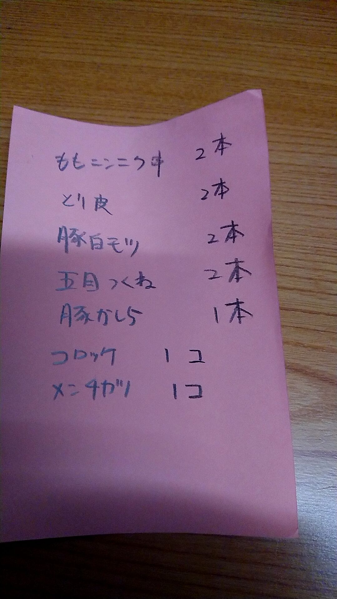 やきとりほしの では紙にオーダーと名前を書いてオバチャンに渡すと、焼き上がれぱ名前呼ばれるシステム。