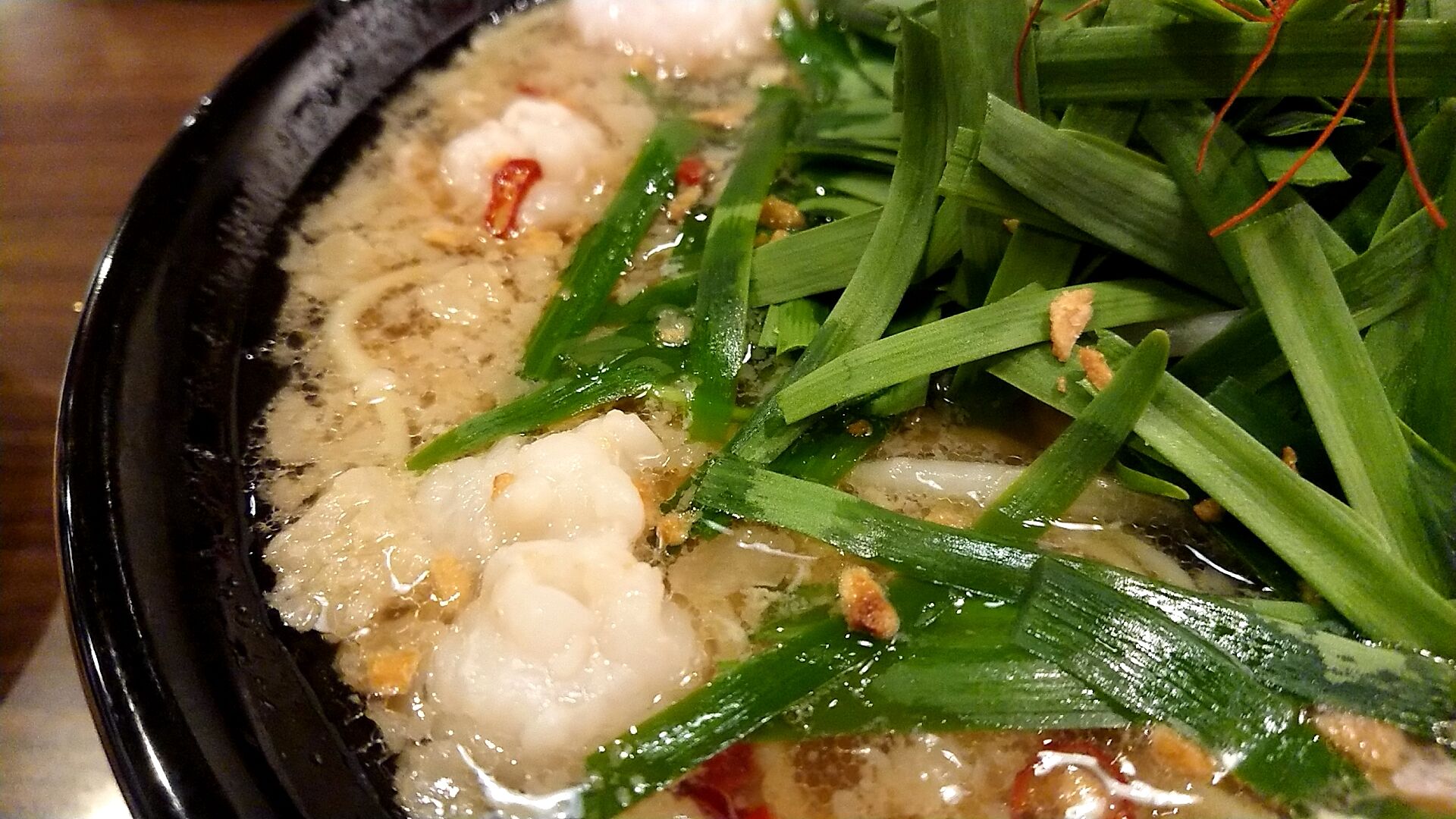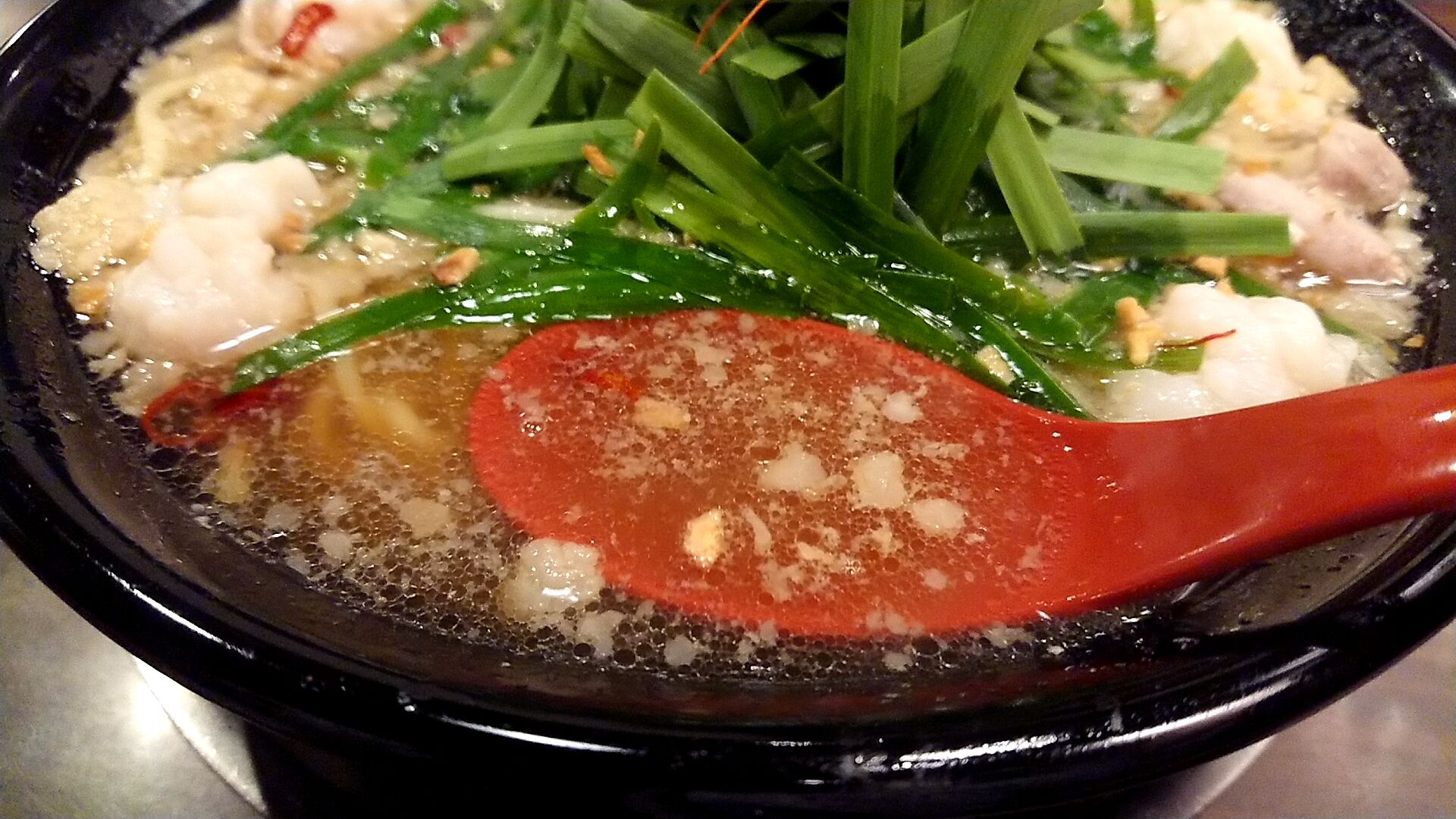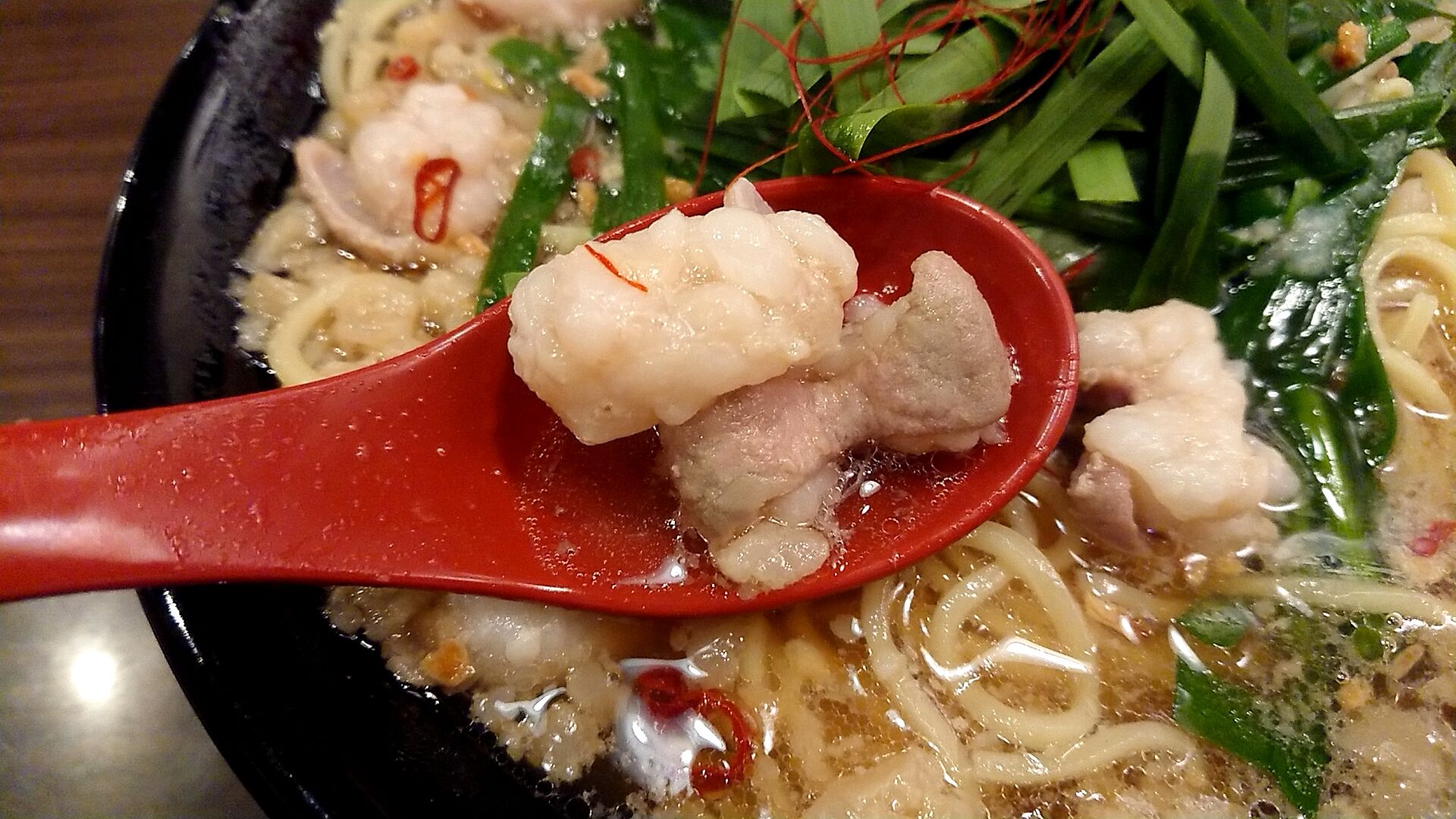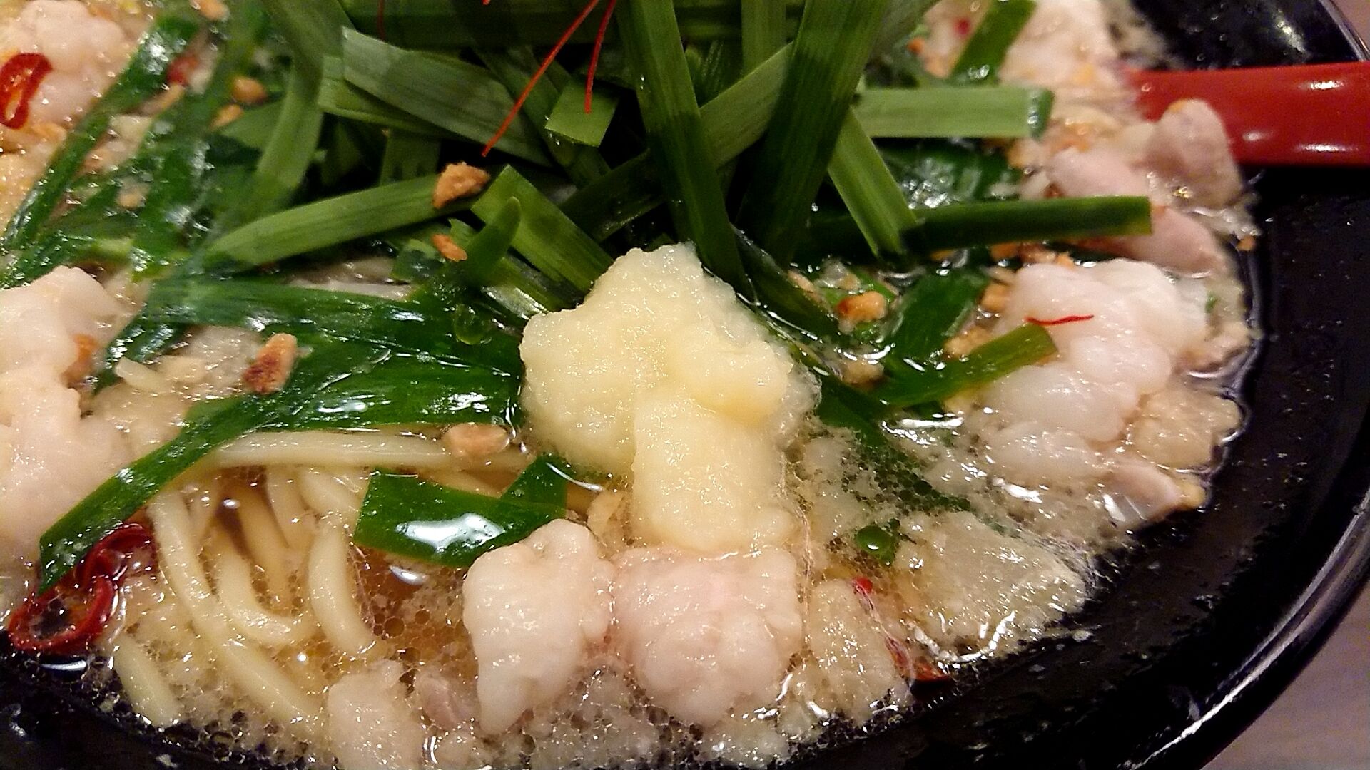背脂も浮いてて、もつはプリプリ系のもつか。