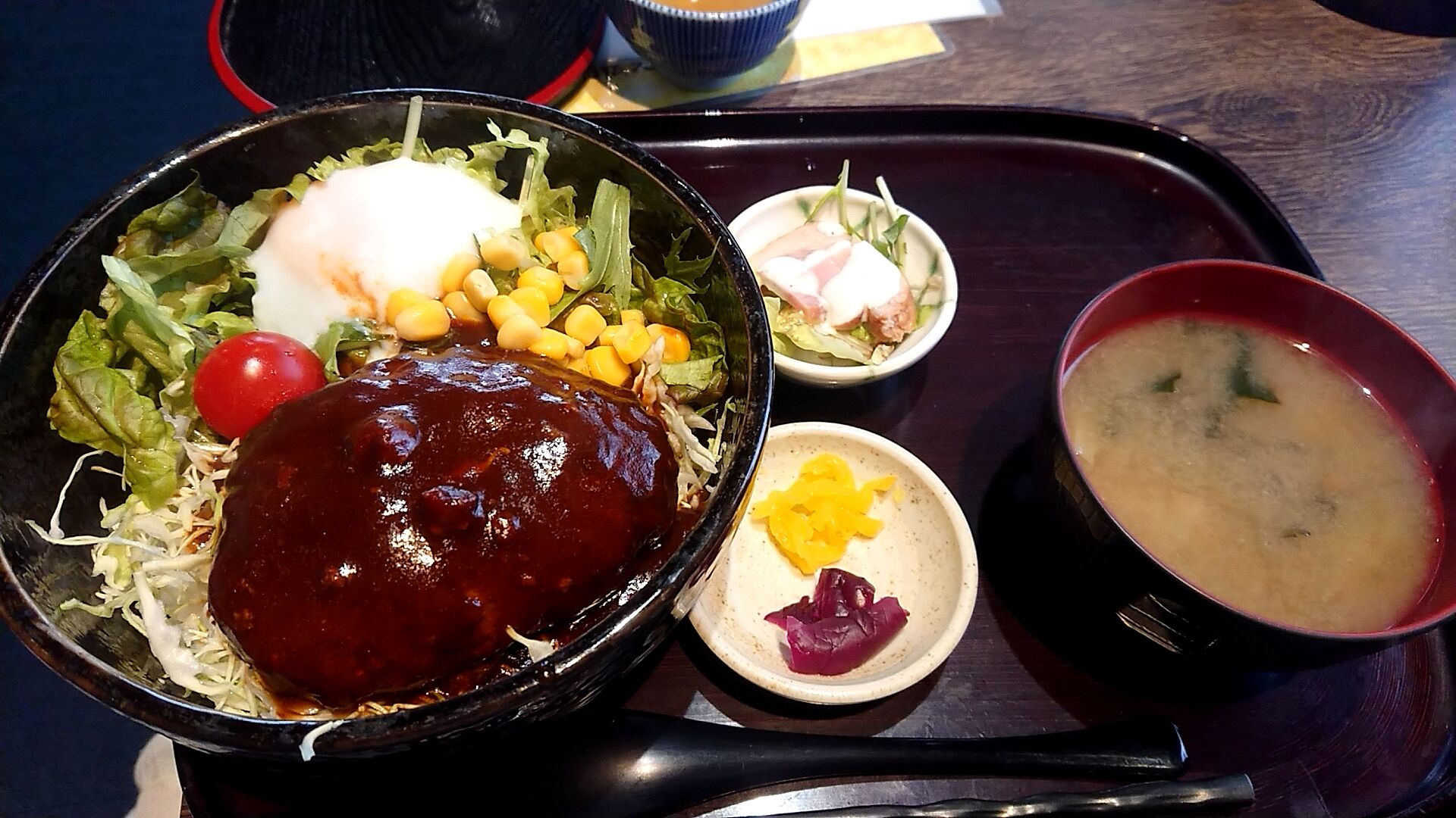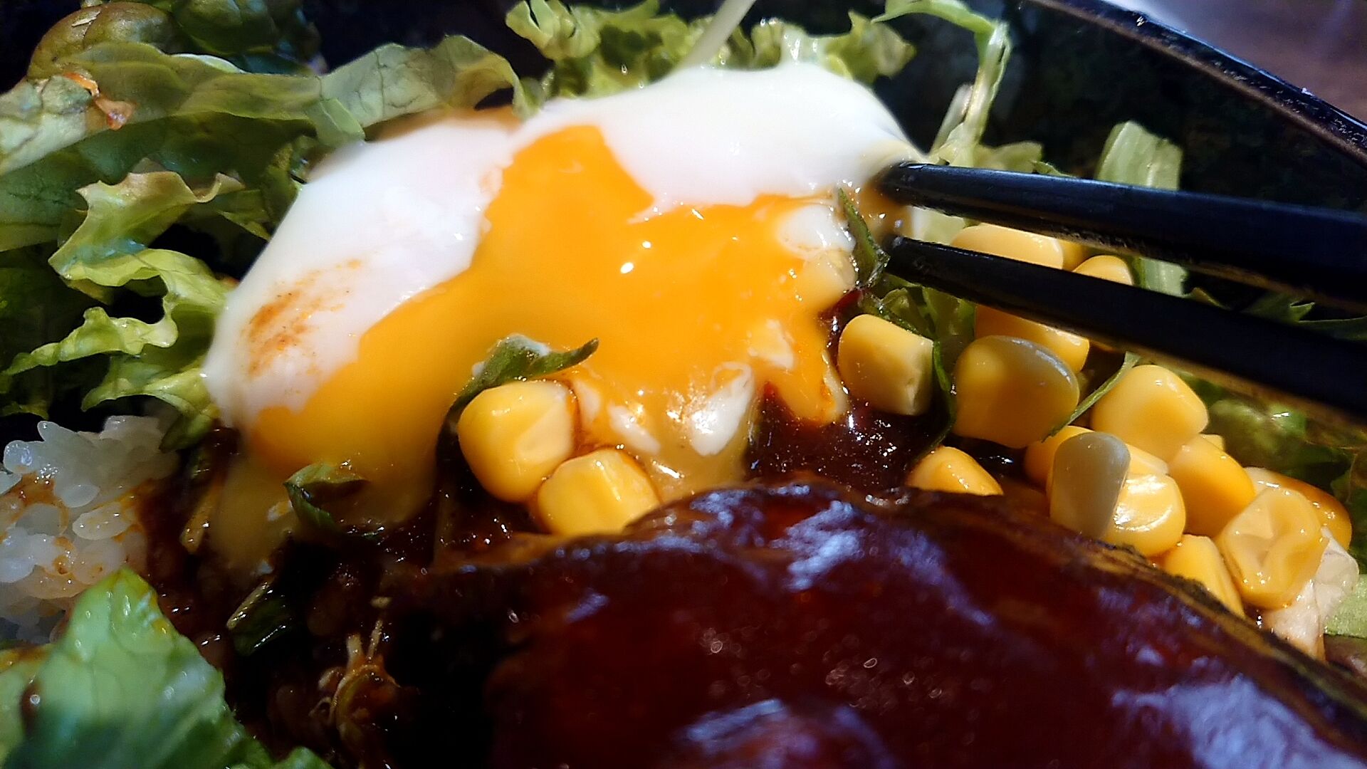 温泉玉子も破ってデミグラスソースハンバーグにつけて食べたりもしますよ!