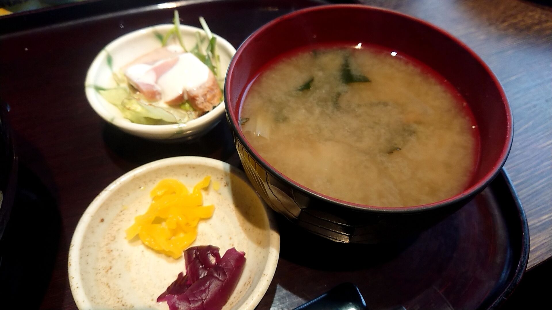 味噌汁にお漬け物と小鉢付き。
