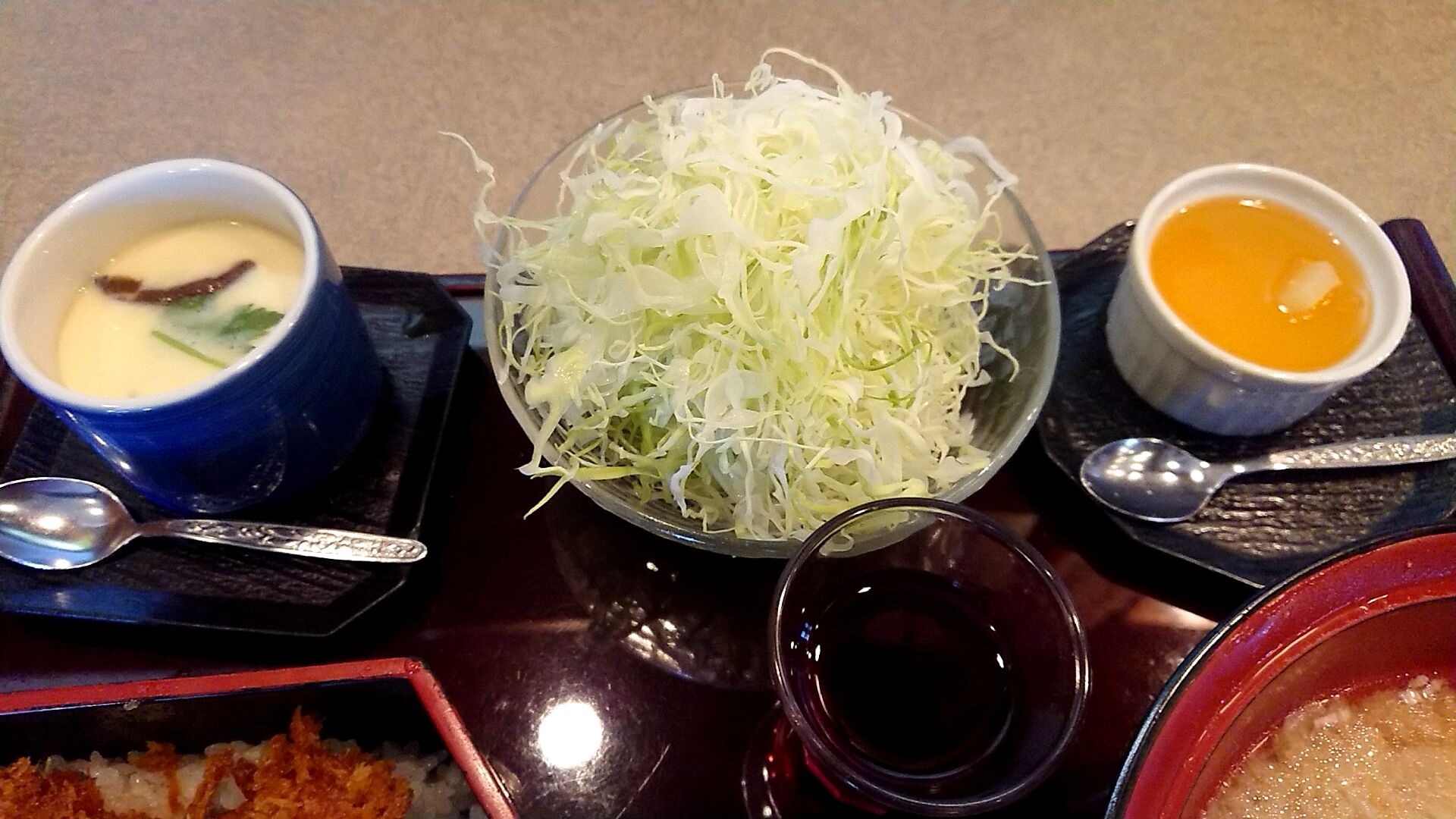 茶碗蒸し、漬け物、サラダにデザート、ぶどうジュース。