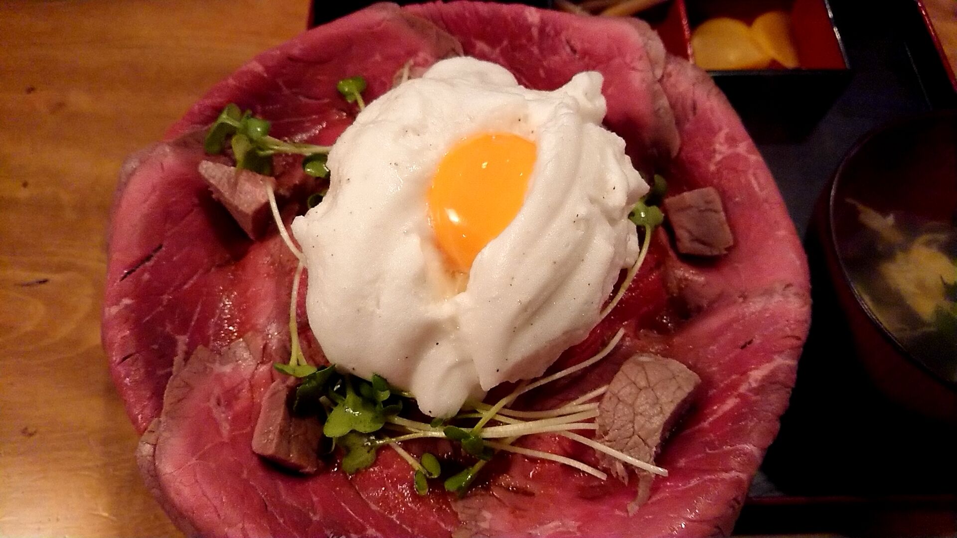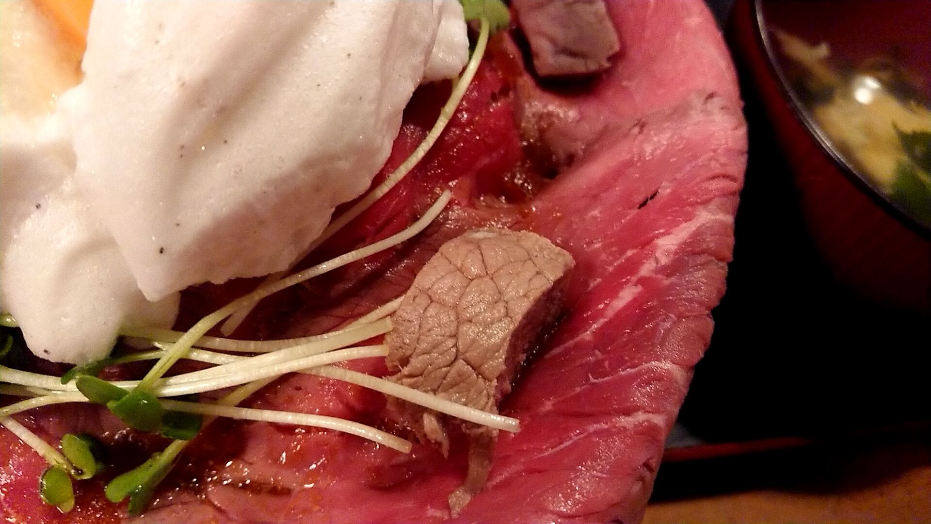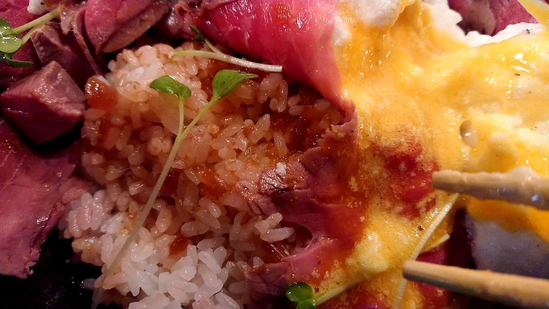 良い具合にレアな赤い肉が花びらのように丼を覆って