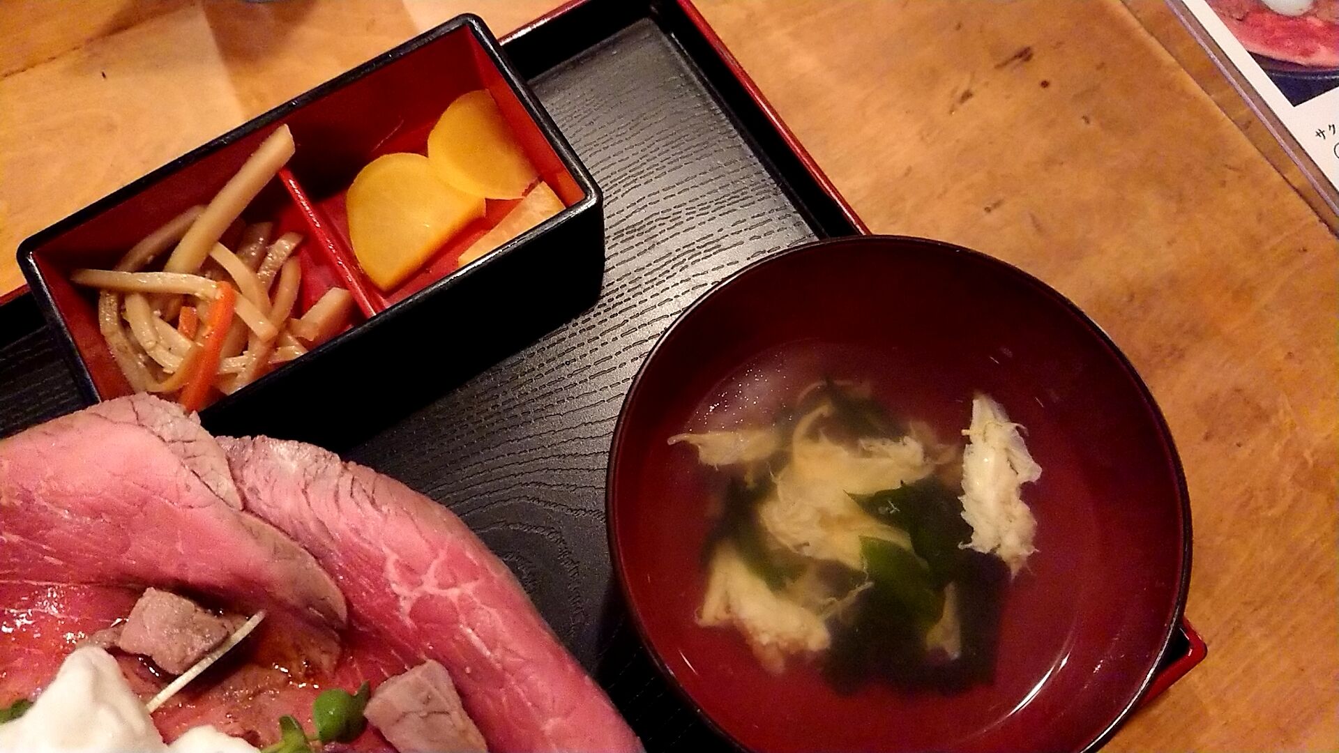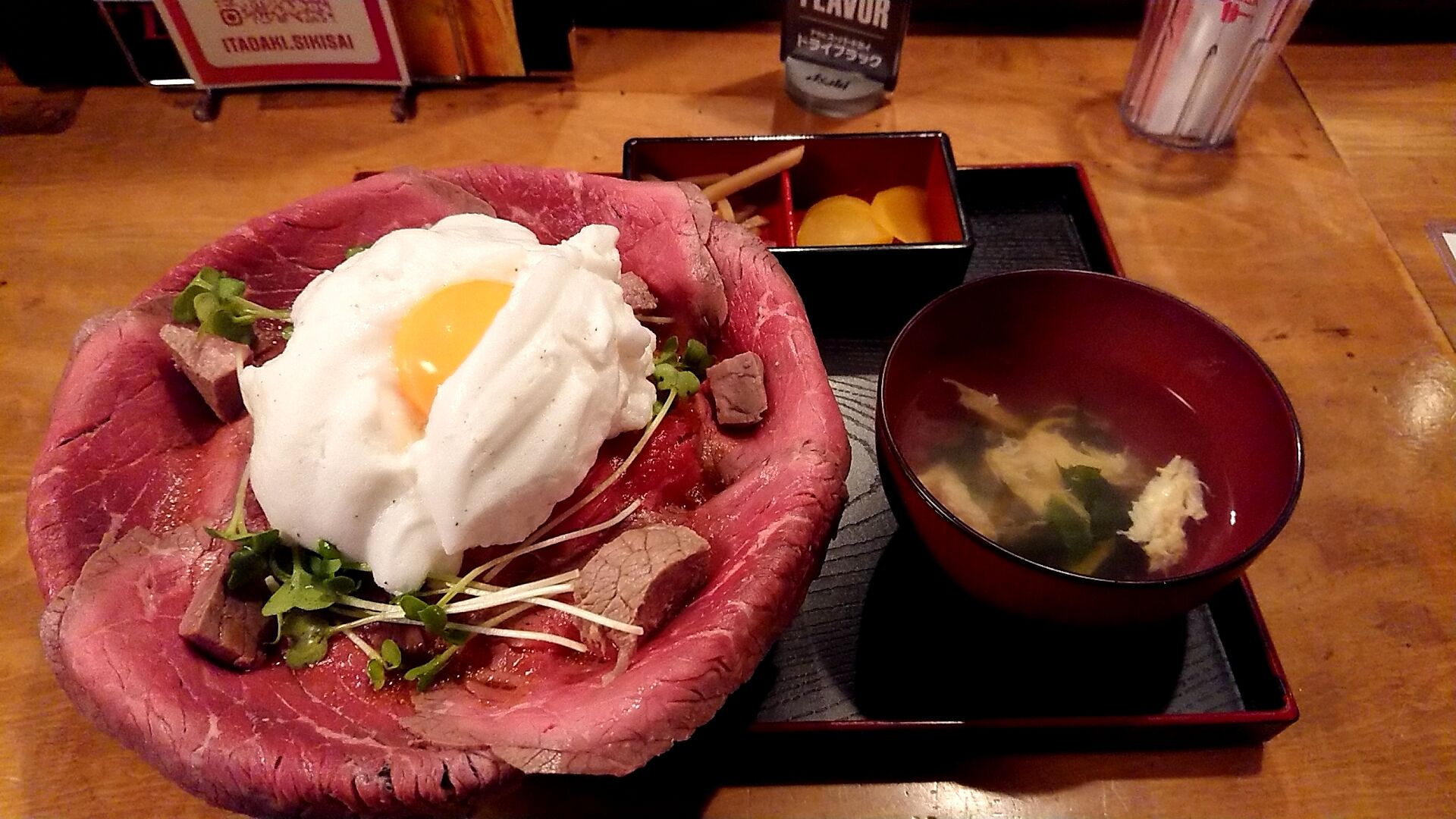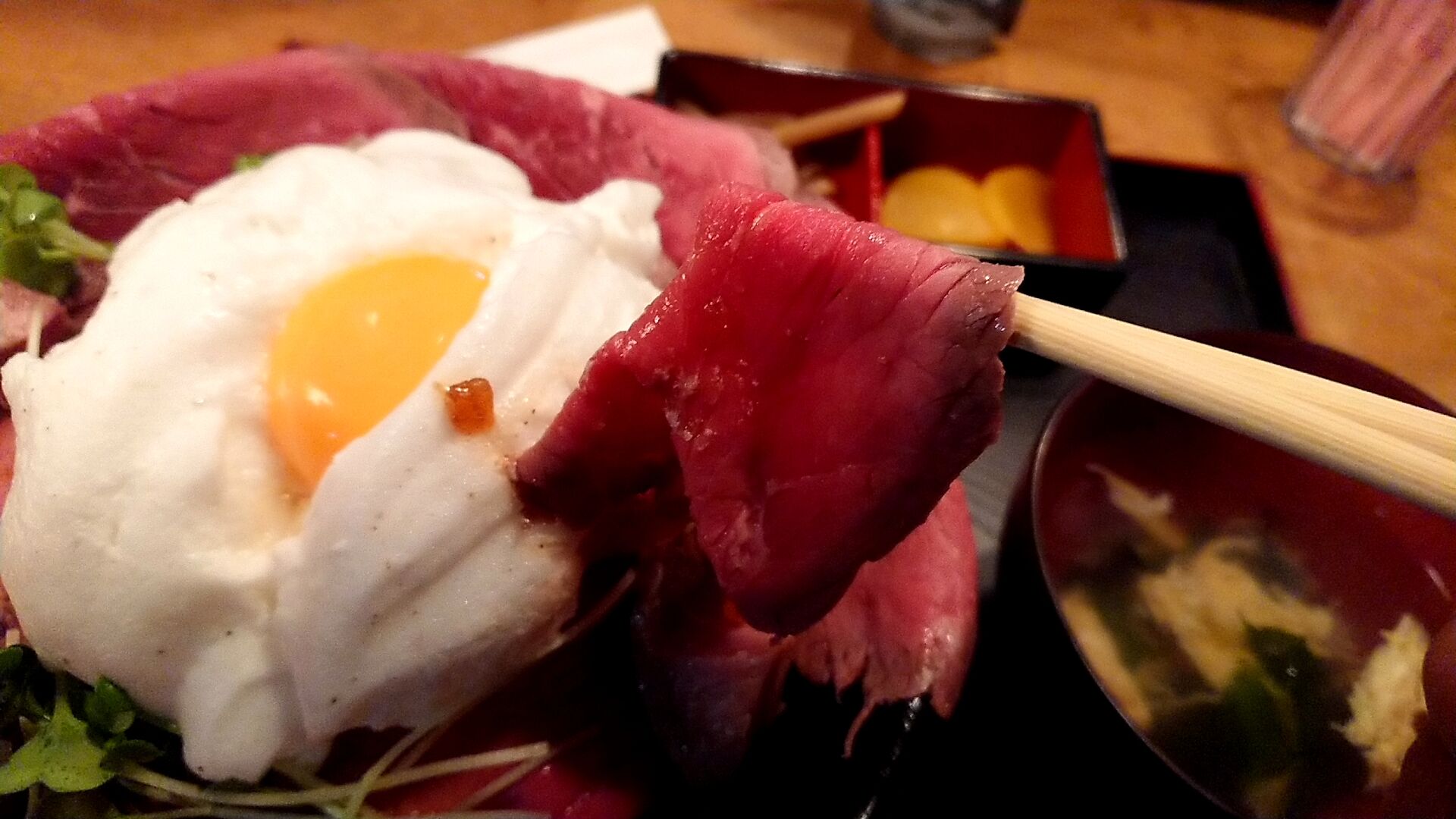 良い具合にレアな赤い肉が花びらのように丼を覆って