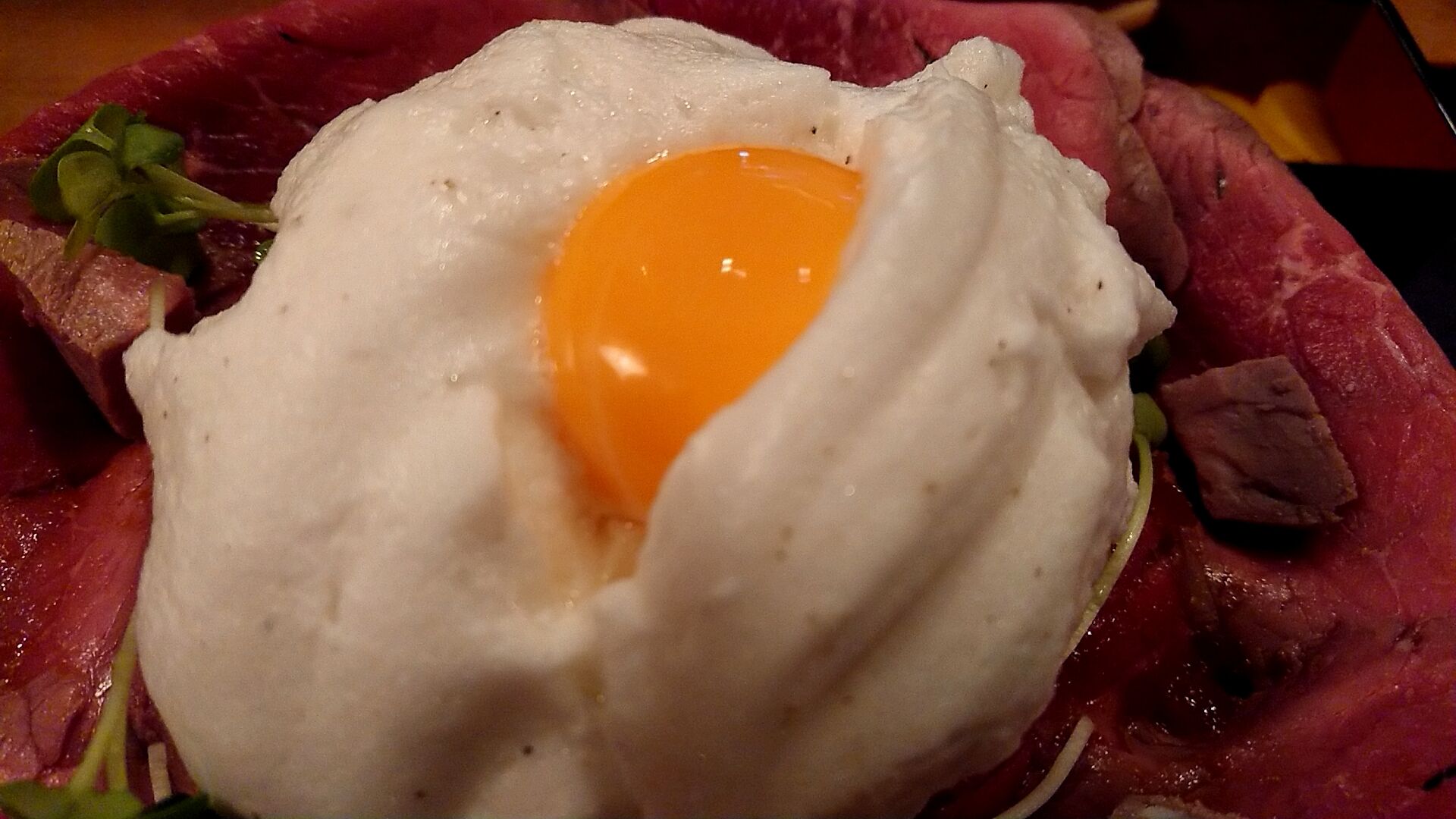 卵黄とメレンゲも溶いて食べると、まろやかさが上がるわ〜。