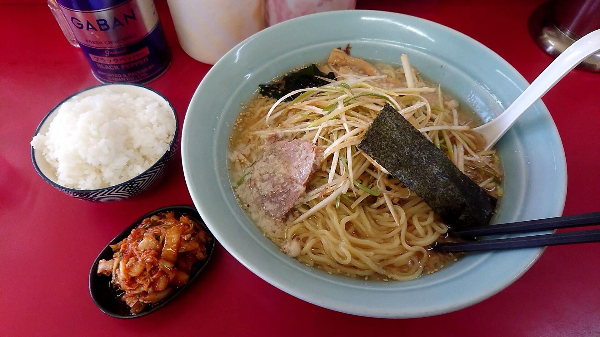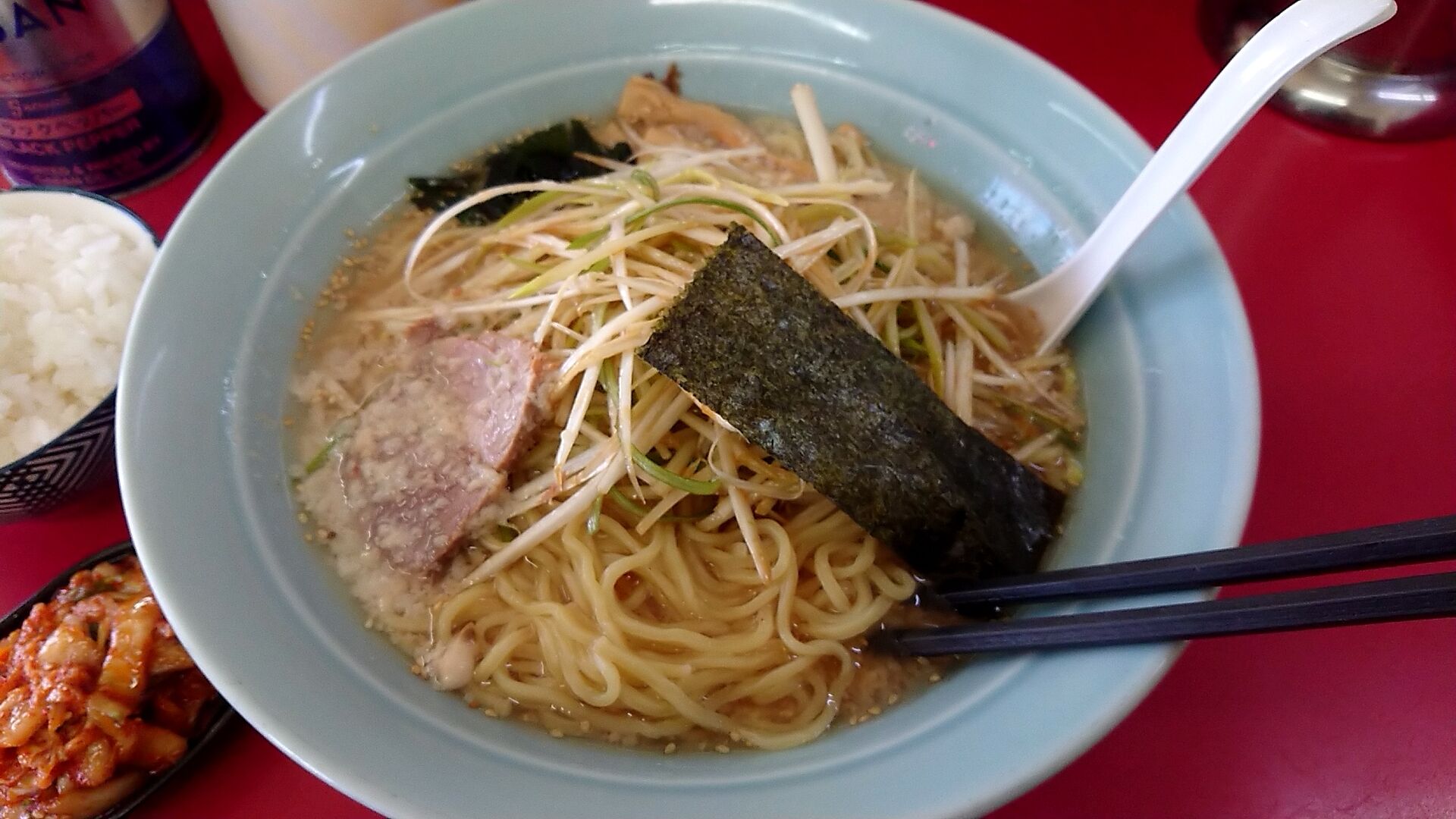 よ〜し、今回はネギみそラーメン大盛にライス100円+無料サービスのキムチというラーメンショップよくばりセット!!!!