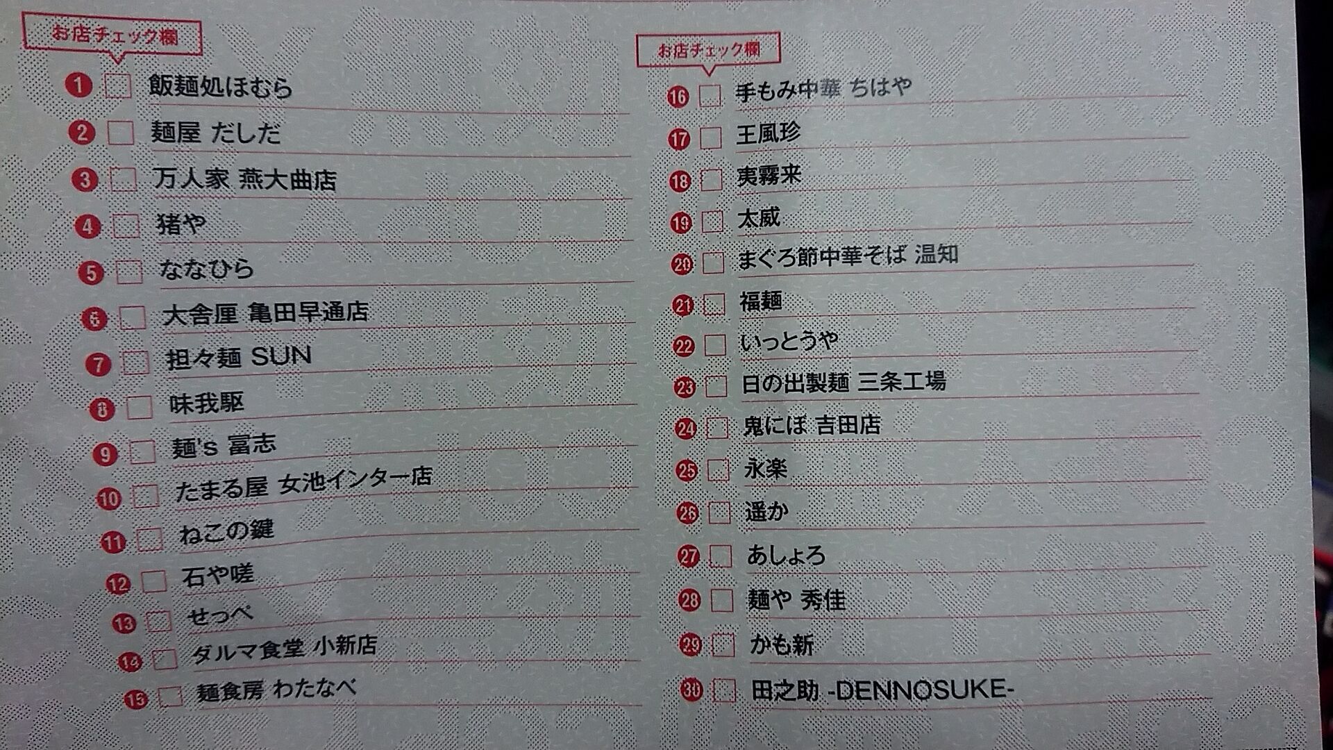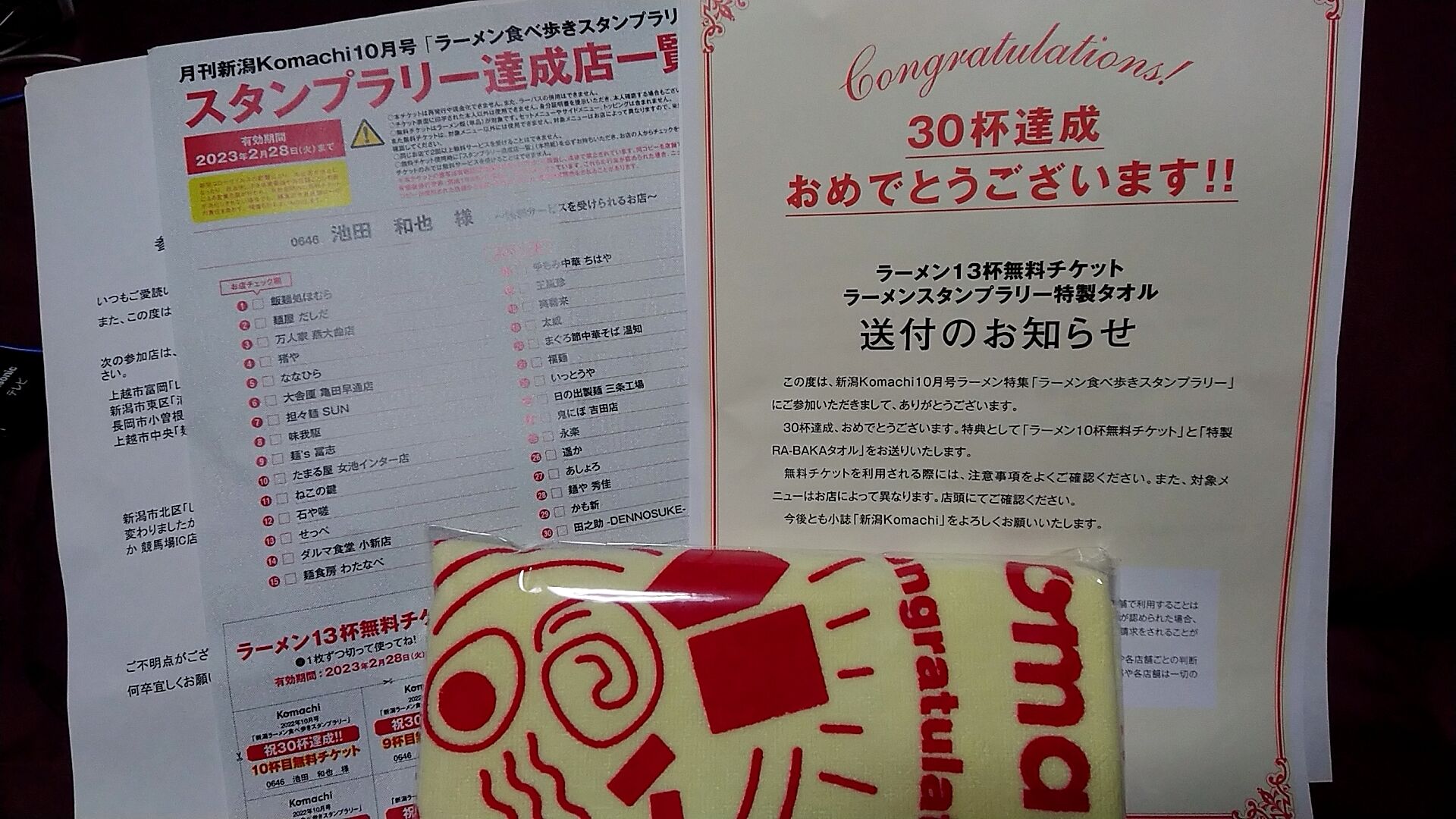 komachiラーメンスタンプラリー2022の賞品のタオルとラーメン13杯無料チケットが届きました! 2022年12月02日 今年も達成しました。 ラーメン30店舗スタンプラリー!! 今年もタオルをいただきました! 毎年10枚だったラーメン無料チケットは、今年は太っ腹にも13枚。 この中から13店舗でラーメン再び食べられるから楽しみだなぁ。 < 前の記事次の記事 > コメント コメントフォーム 名前 コメント 記事の評価 リセット リセット 顔 星 情報を記憶 コメントを投稿する