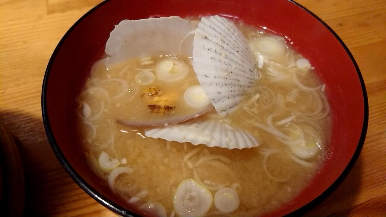 うは〜、ホタテの稚貝の入った味噌汁もうめぇ!