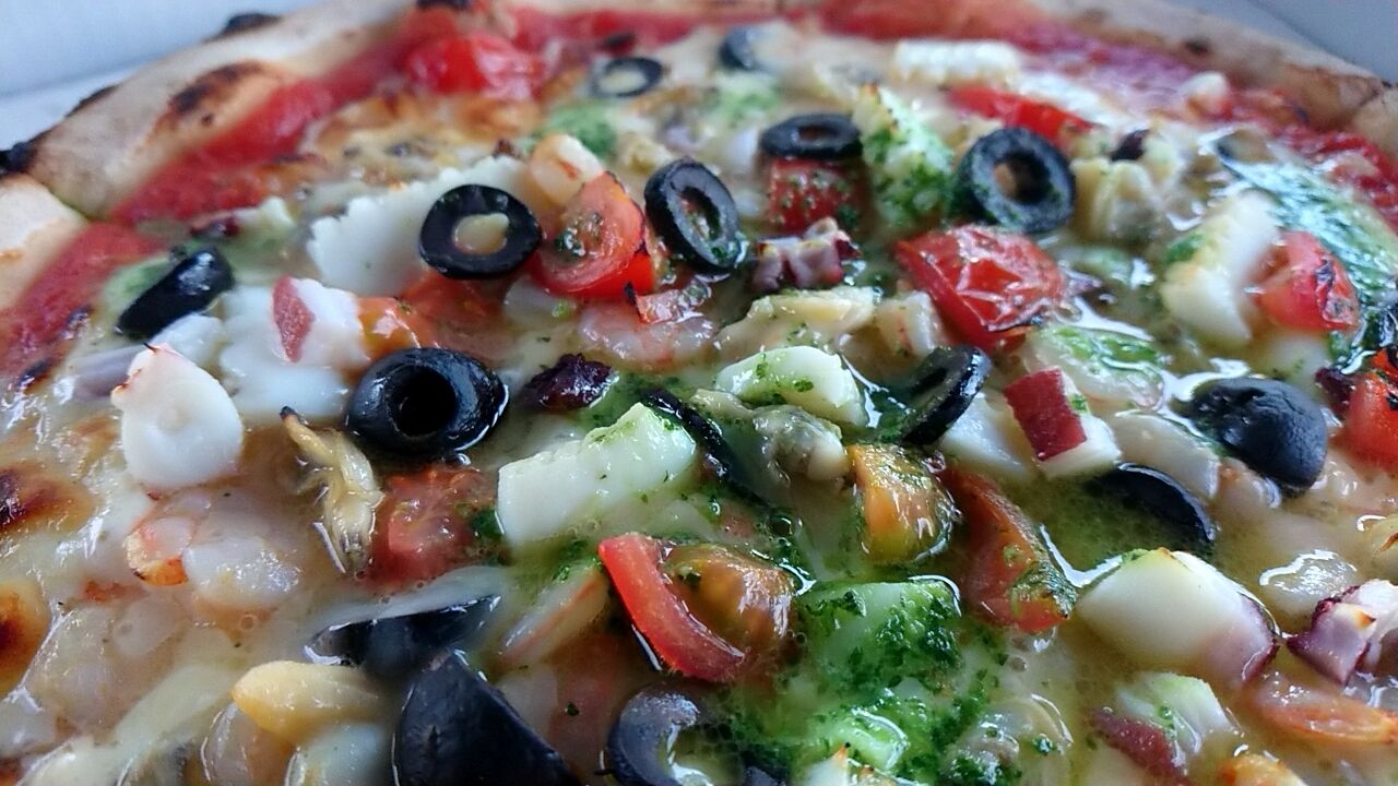 ミニトマトにオリーブの実、そしてバジルにタコ・イカ・貝類のシーフードミックス。