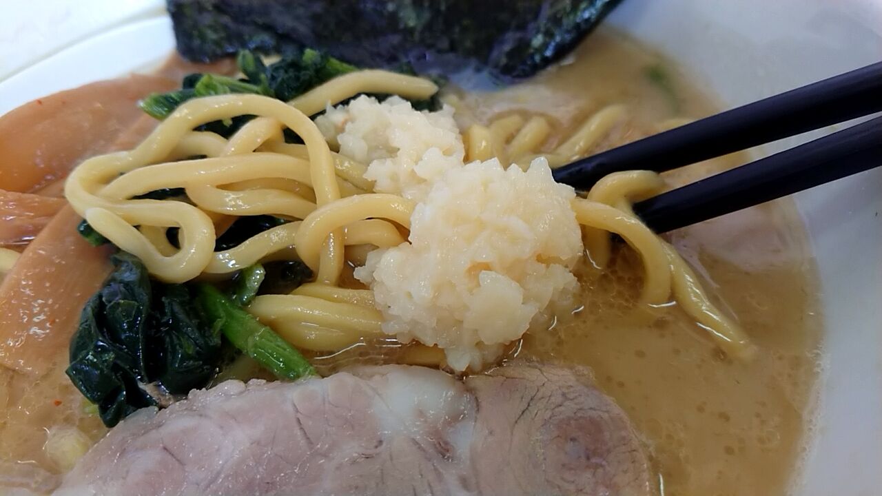 く〜っ!!やっぱり動物系の強烈な濃い目の豚骨醤油にニンニクはたまらんっ!