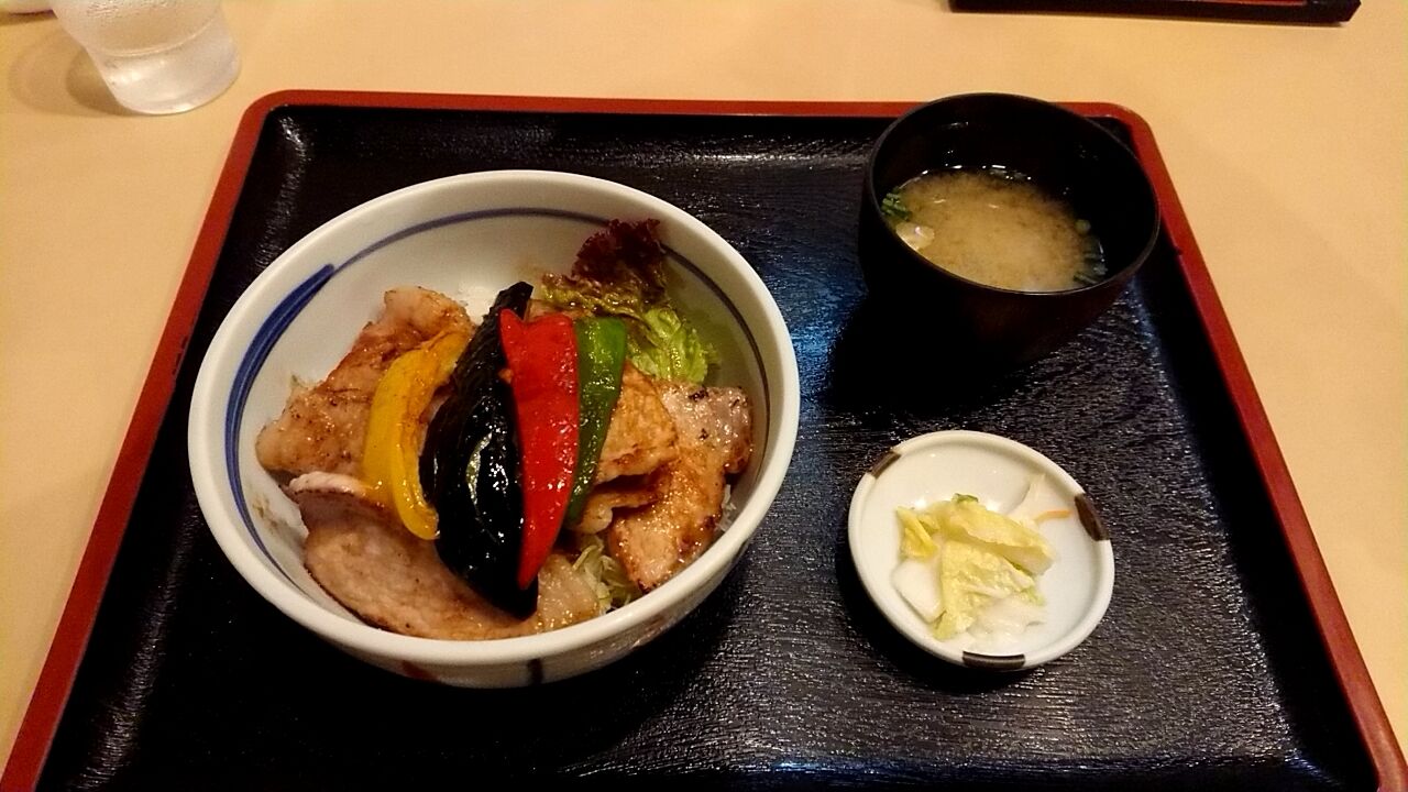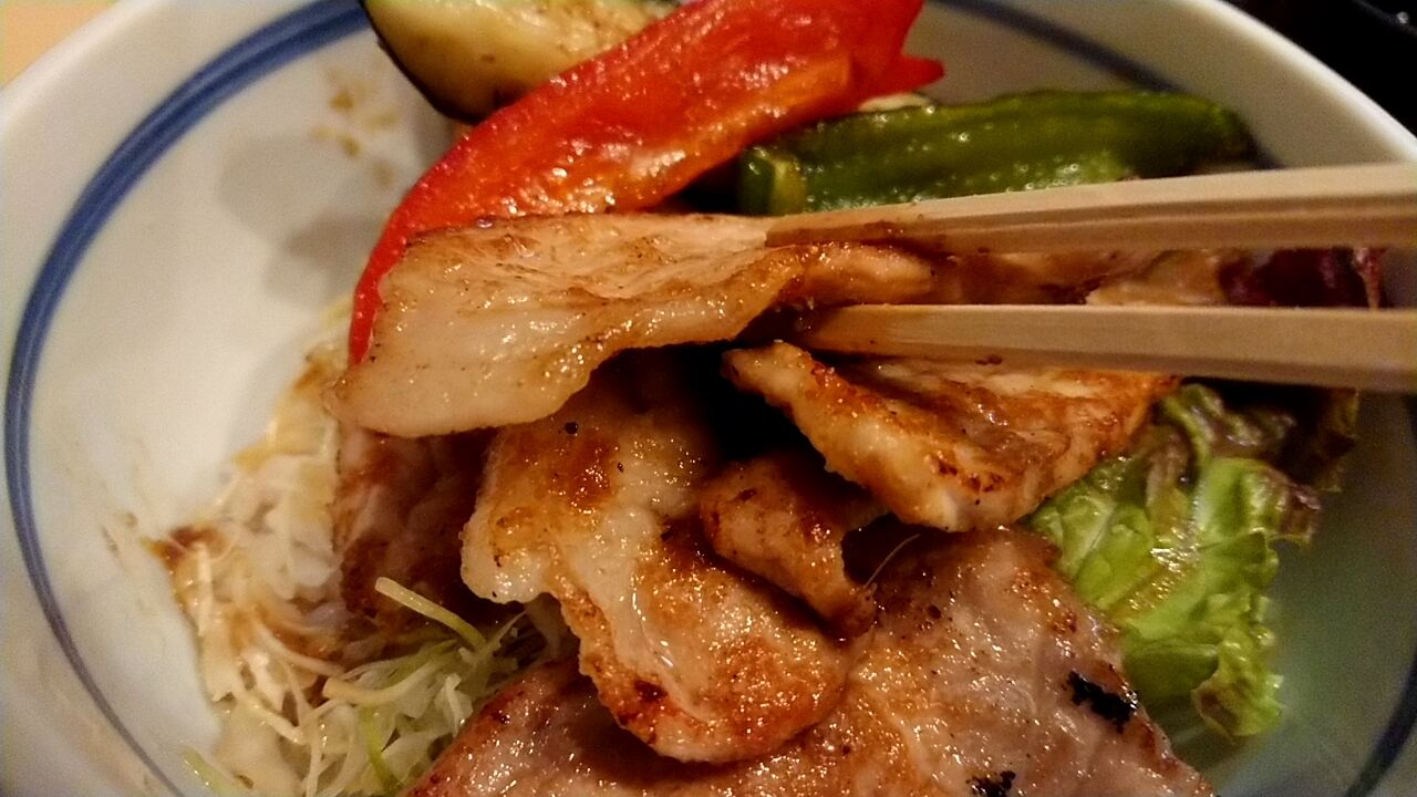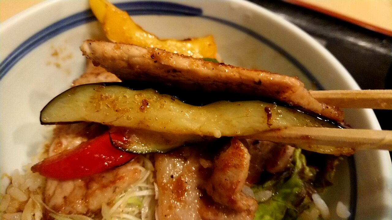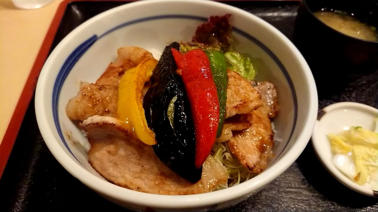 香ばしく焼かれた豚肉に、パプリカやナスが彩り鮮やか。