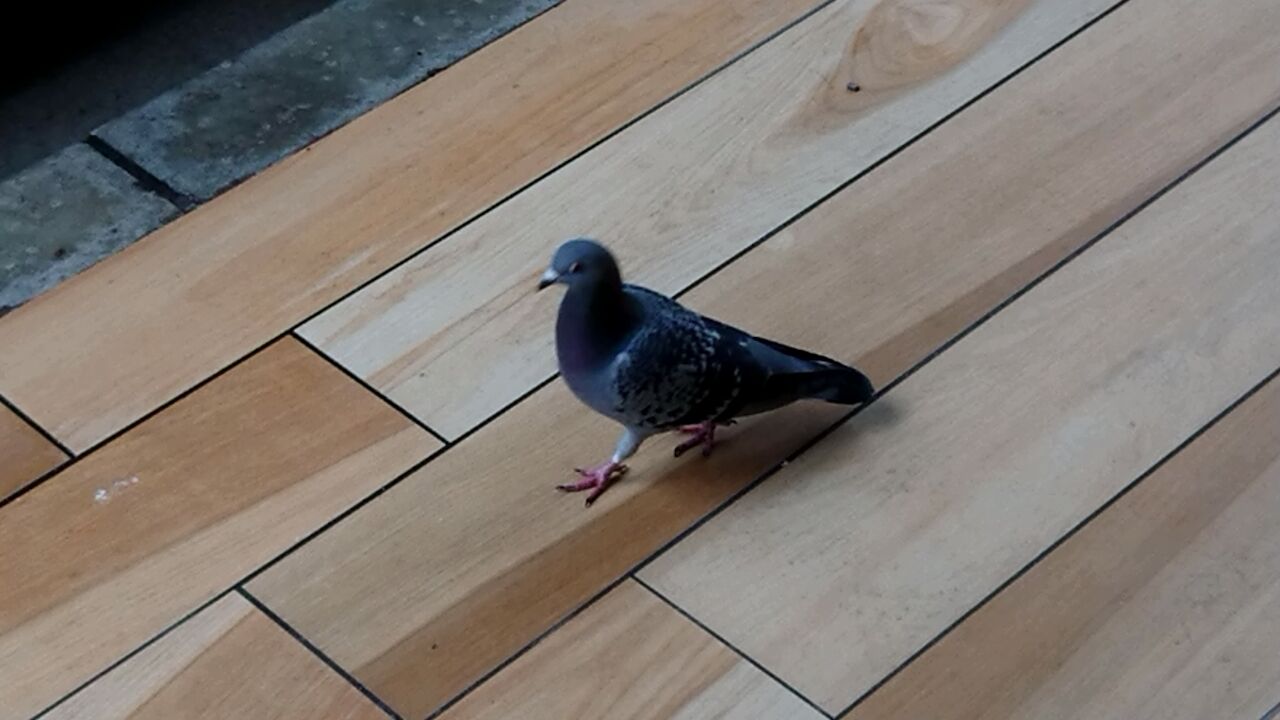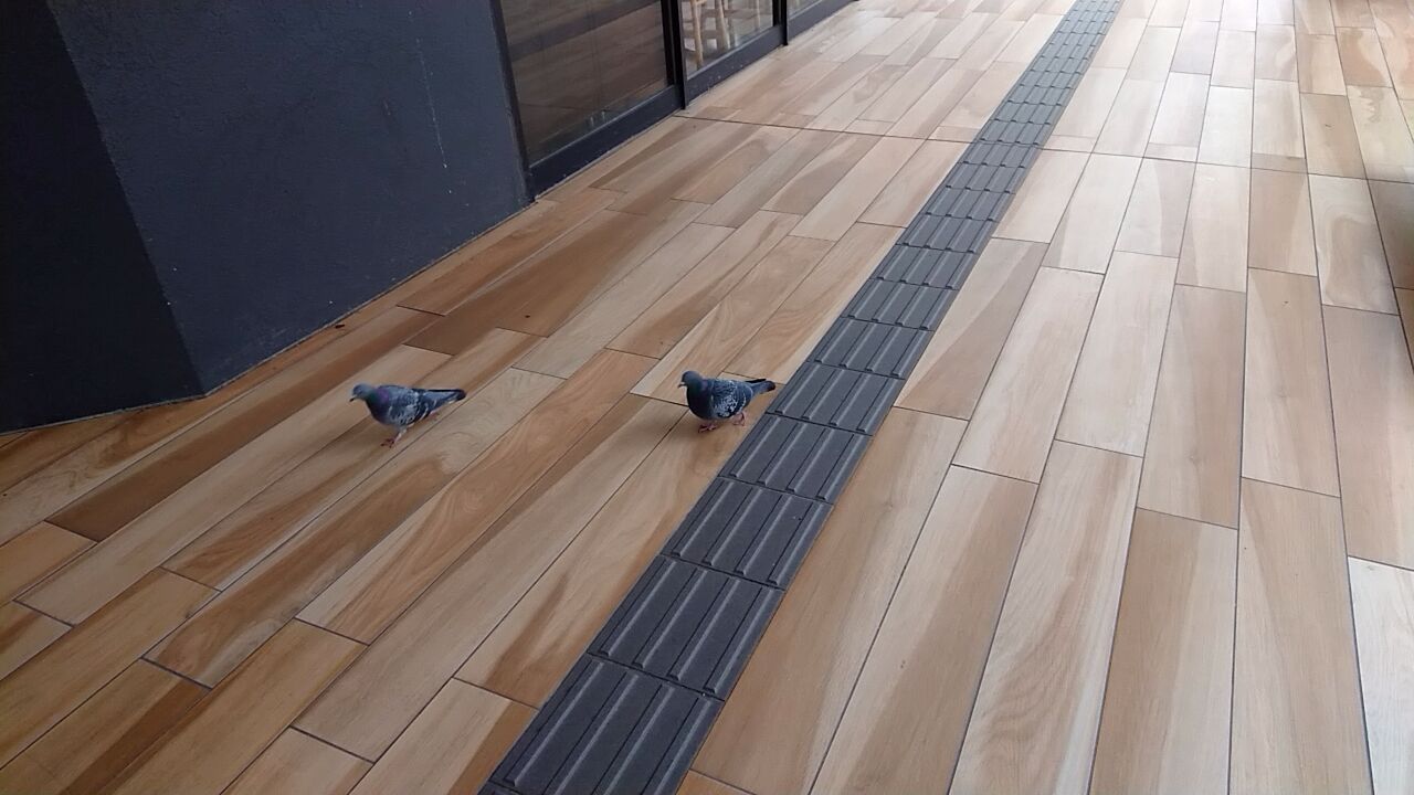パリパリの皮が地面に落ちたら近くのハトがそれを狙ってか近くに!