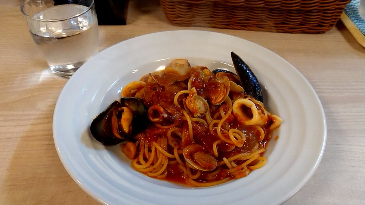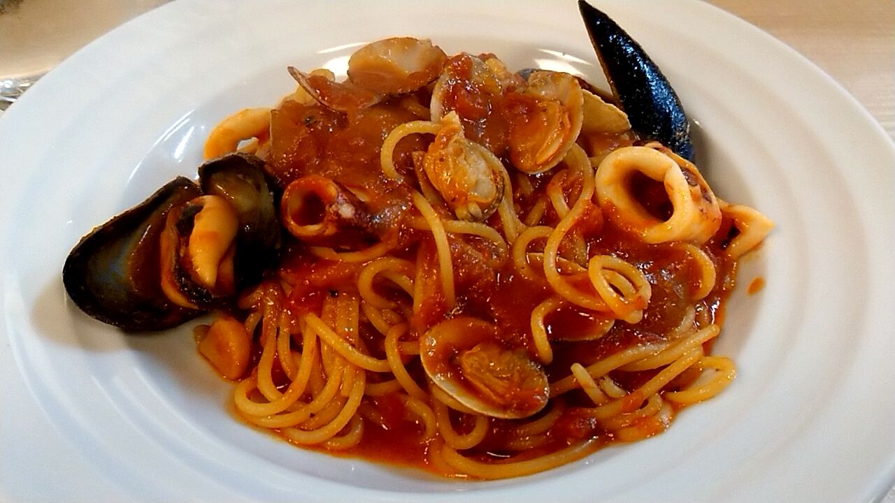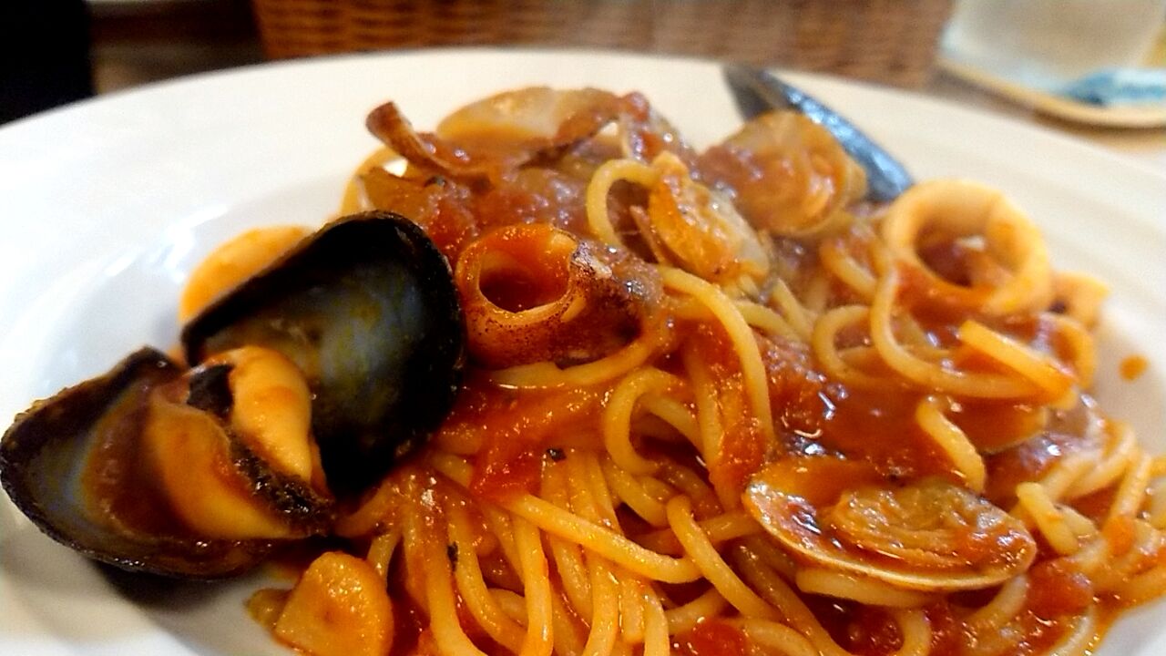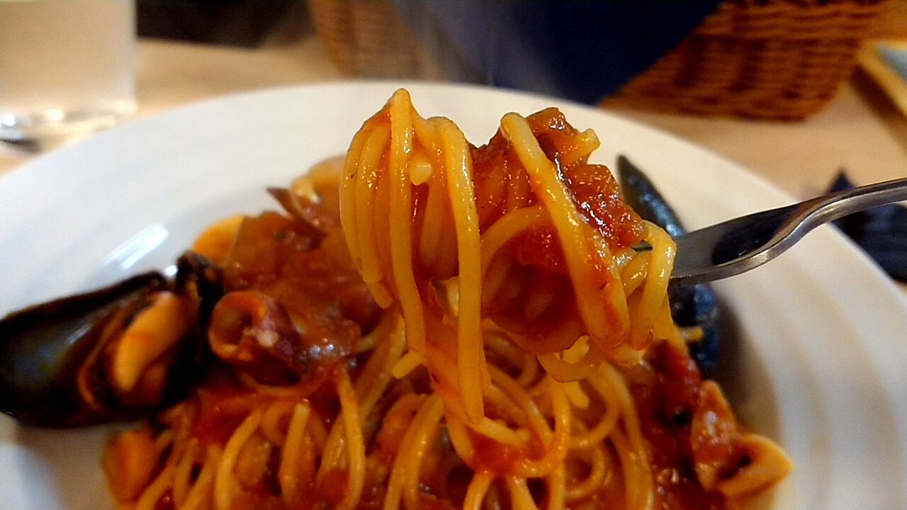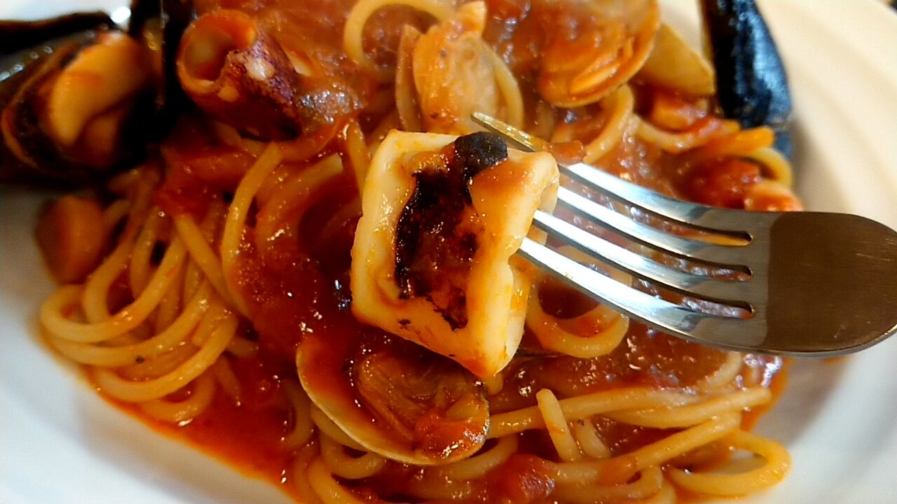 フォークにクルクルと巻き、食べてみると海鮮の風味に濃いトマトにガーリック!!