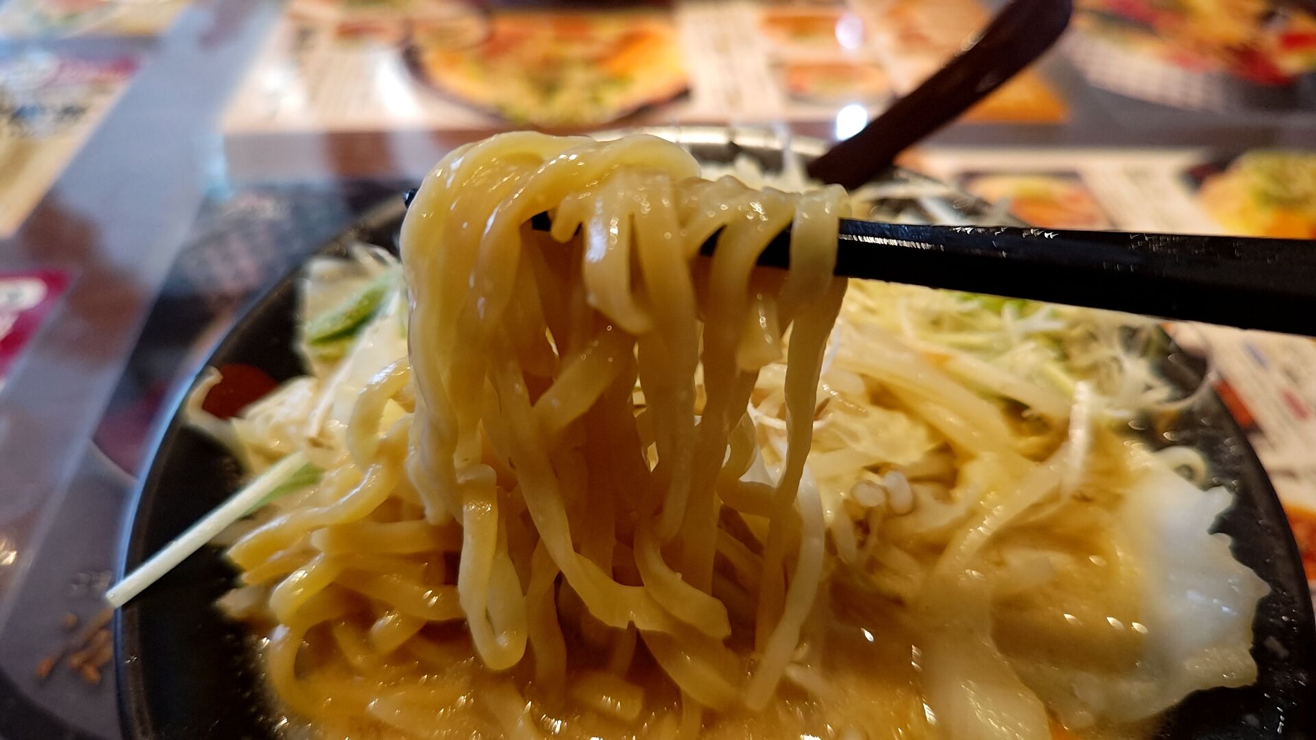 麺はキタカタグループのラーメン店特有の柿渋ポリフェノール麺がツルツルした食感で美味しい。