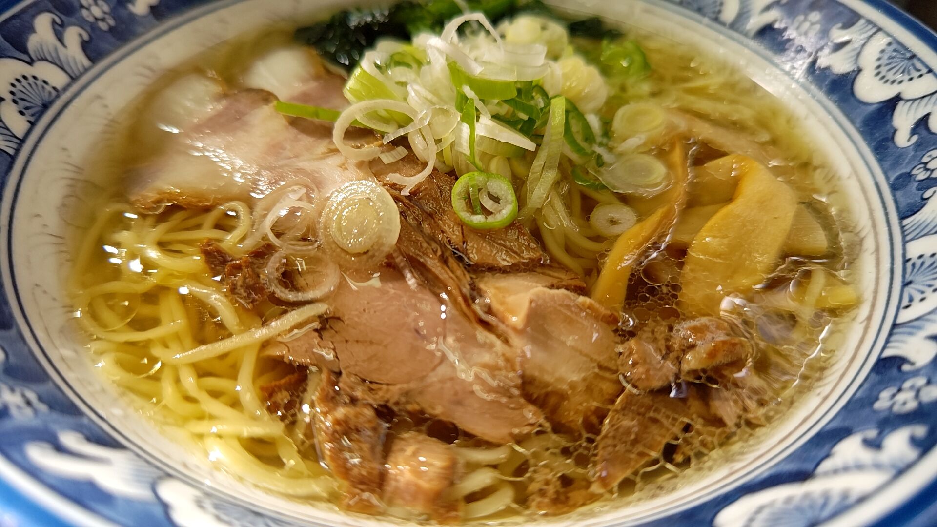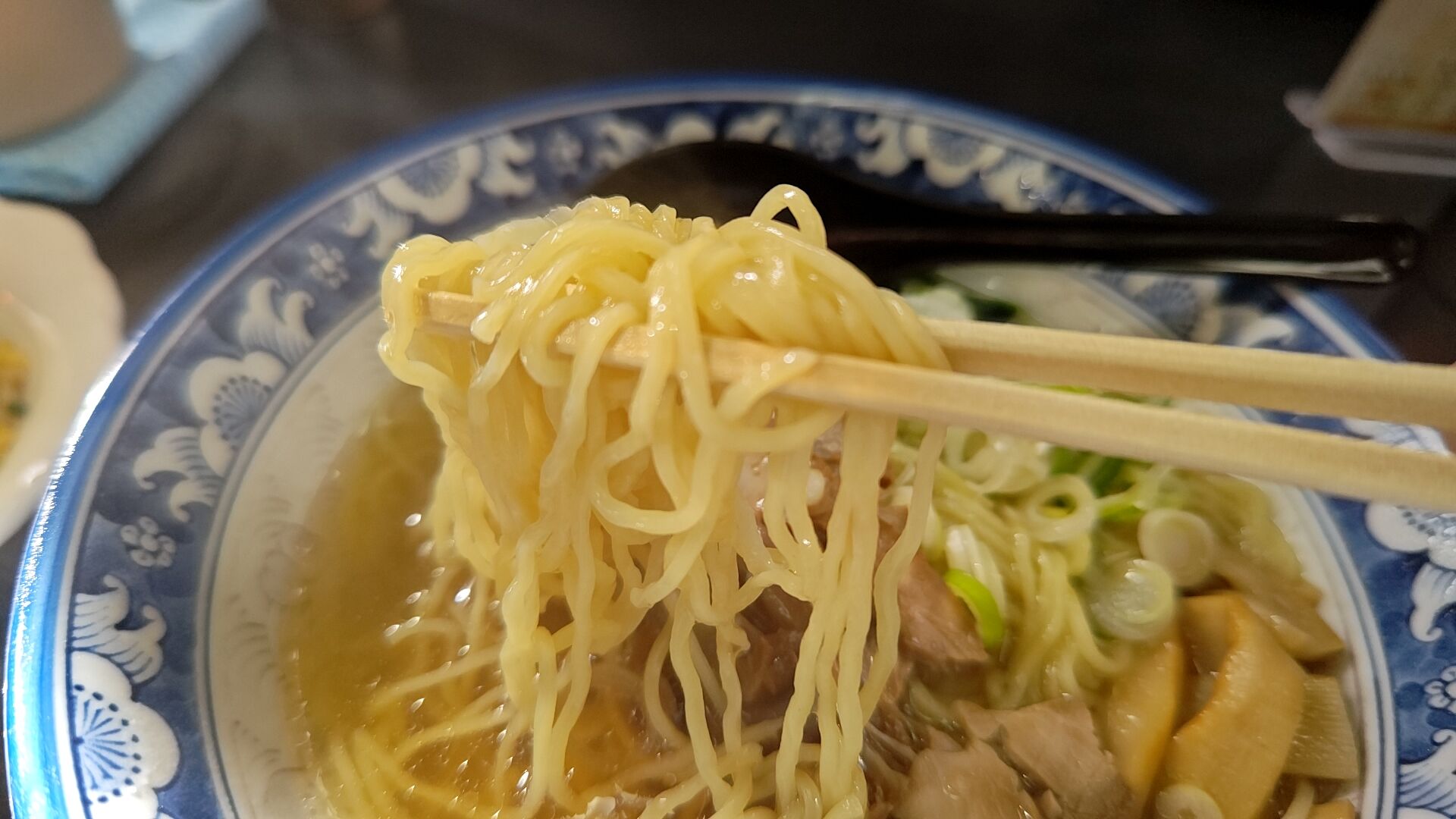 ああ〜、名前の通りに薄い琥珀色に透き通るスープに沈む縮れ麺がたまらんぜ