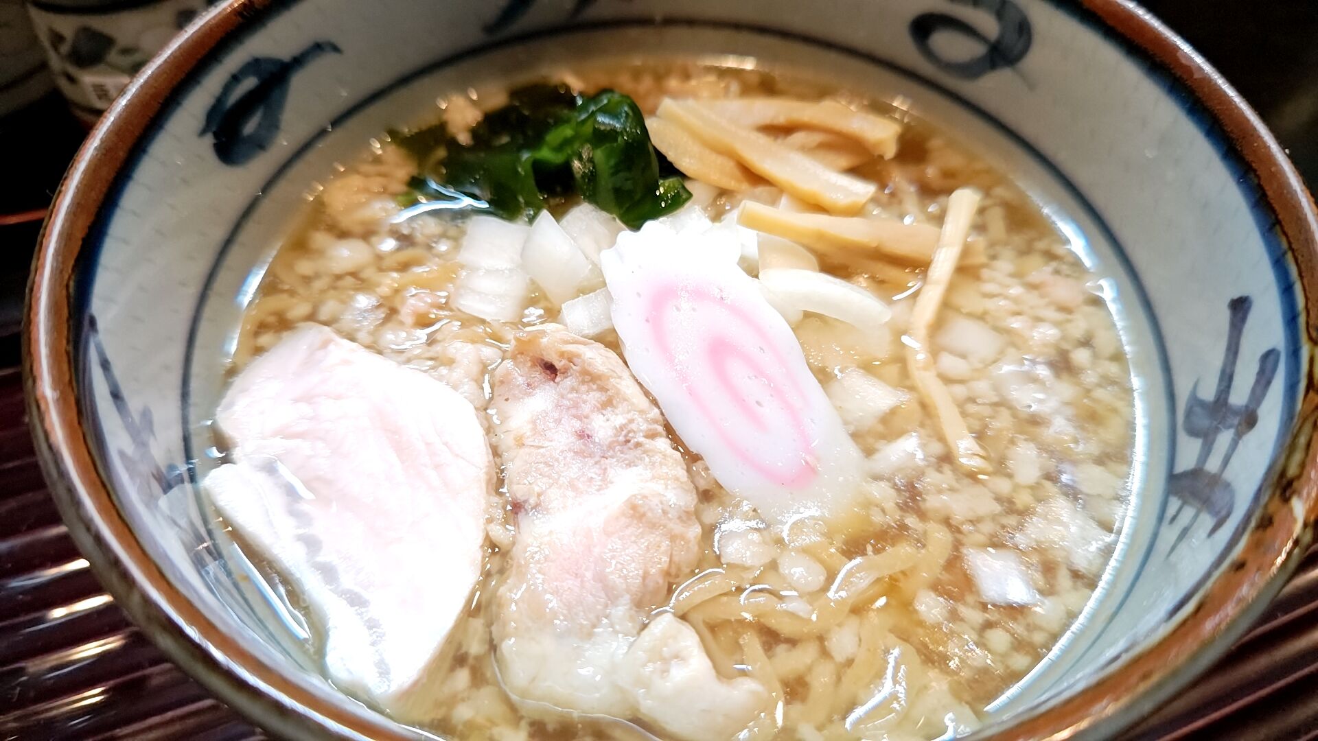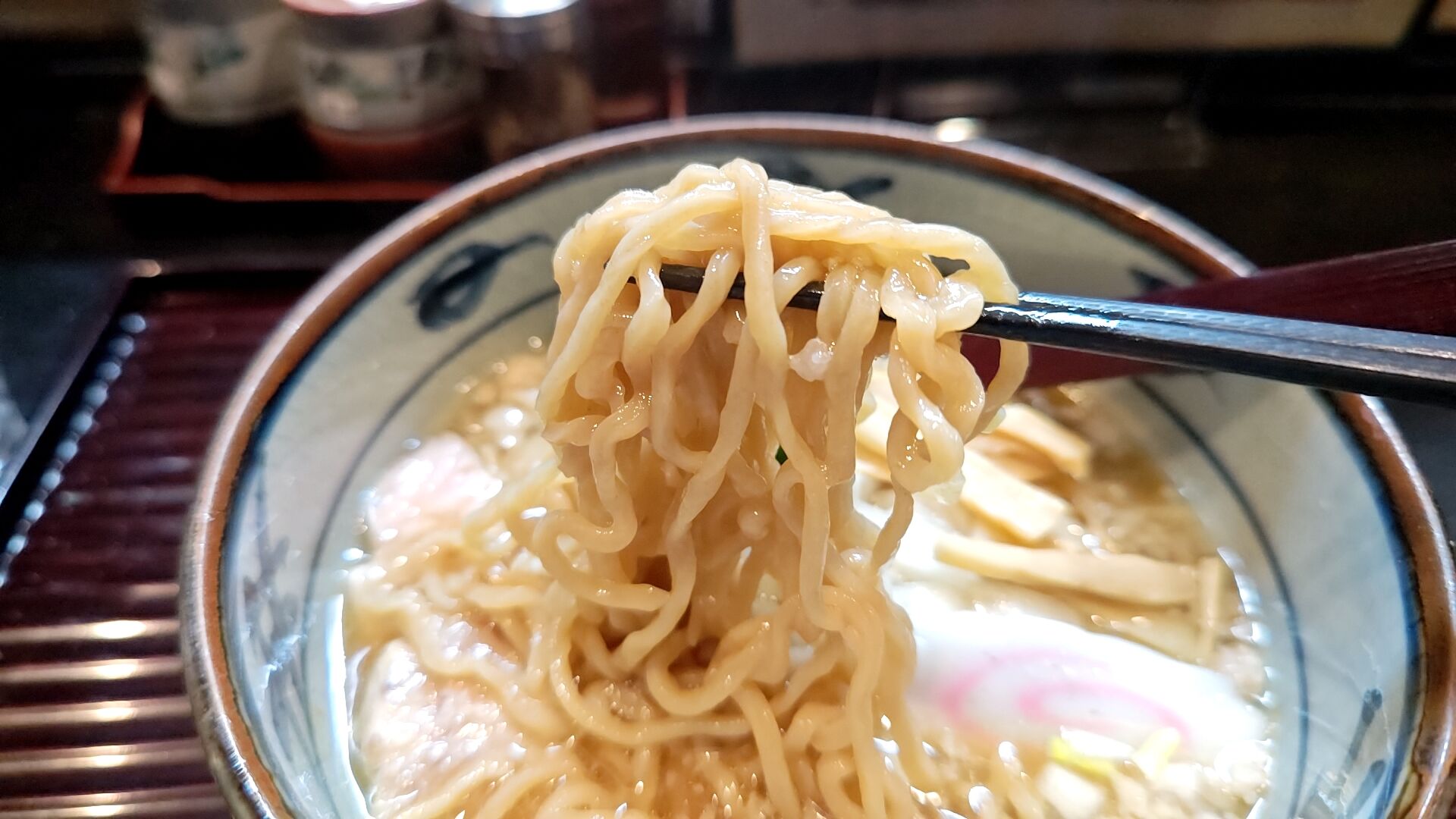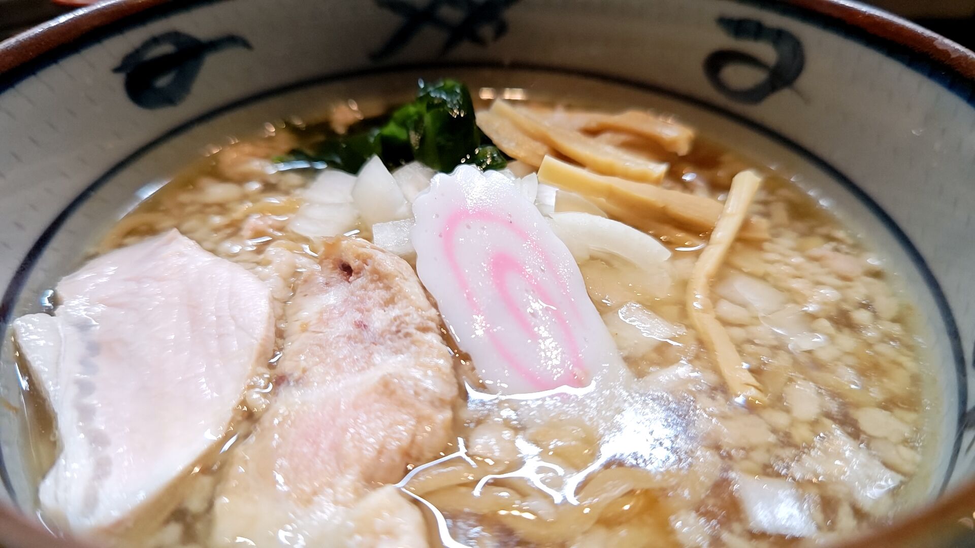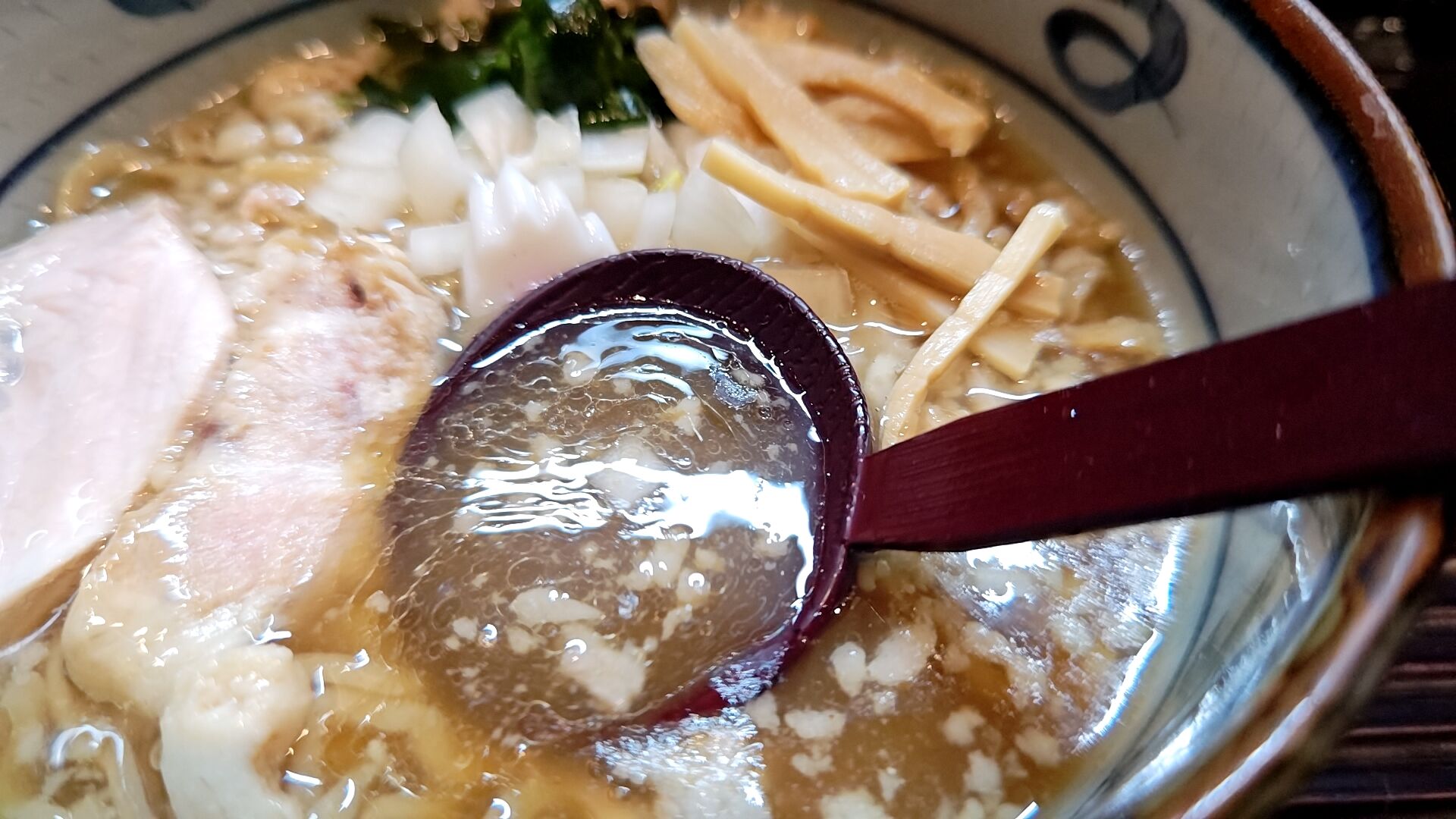 スープの表面を覆う粗めの背脂と刻み玉ねぎがいい感じ。