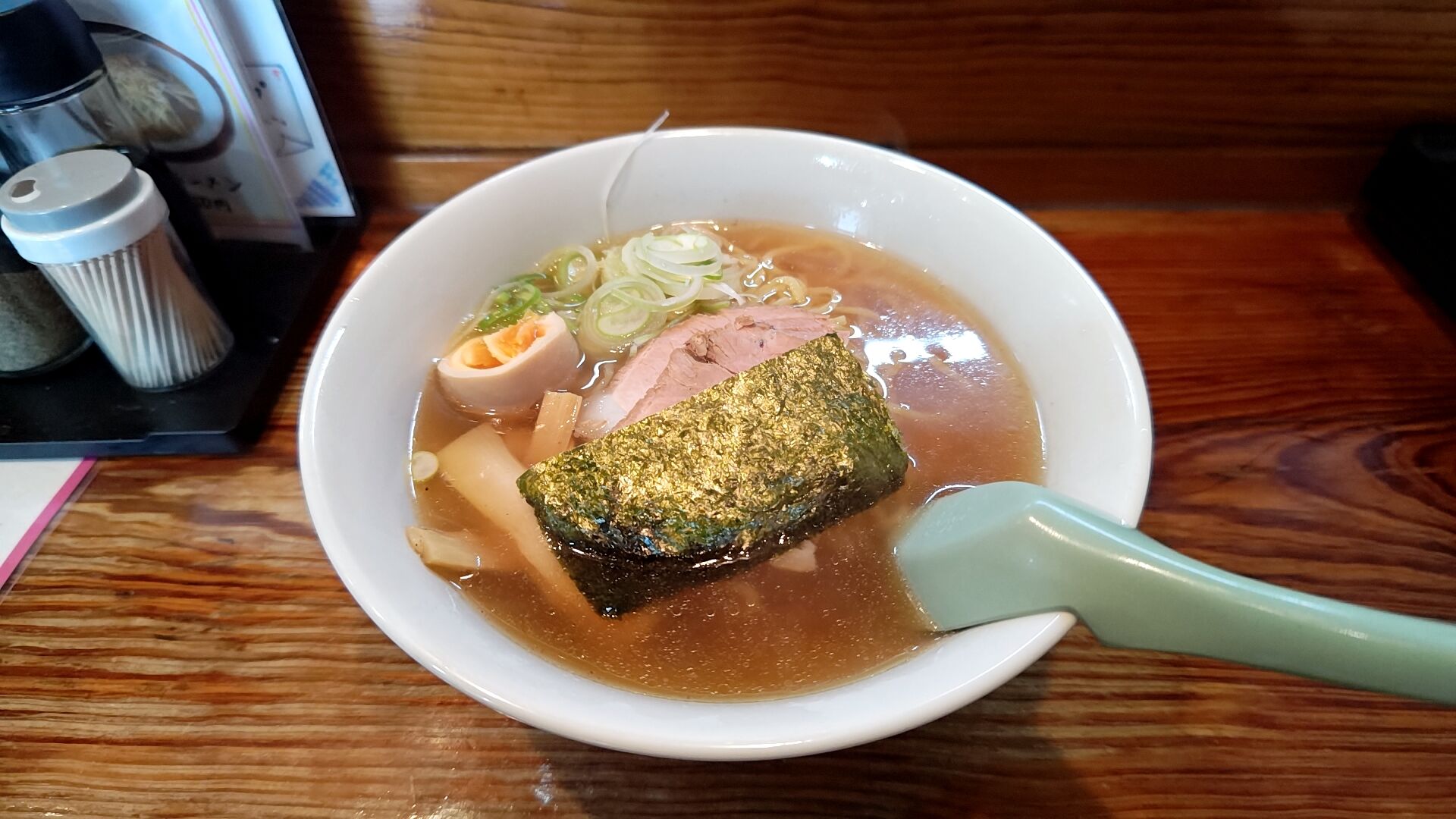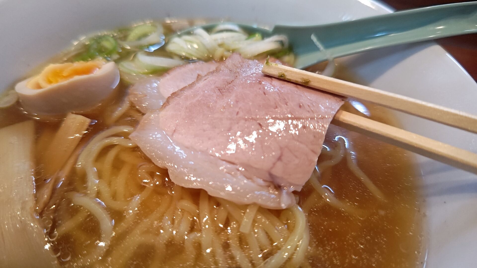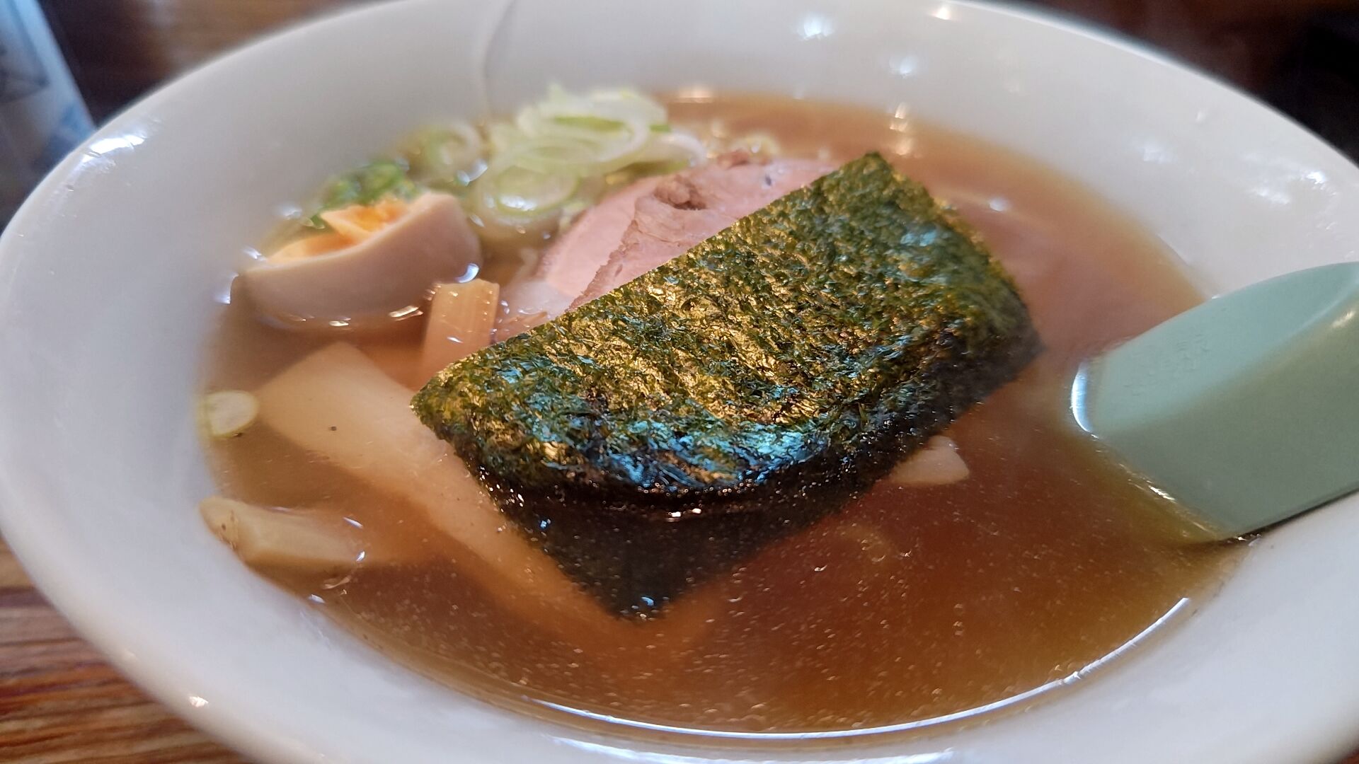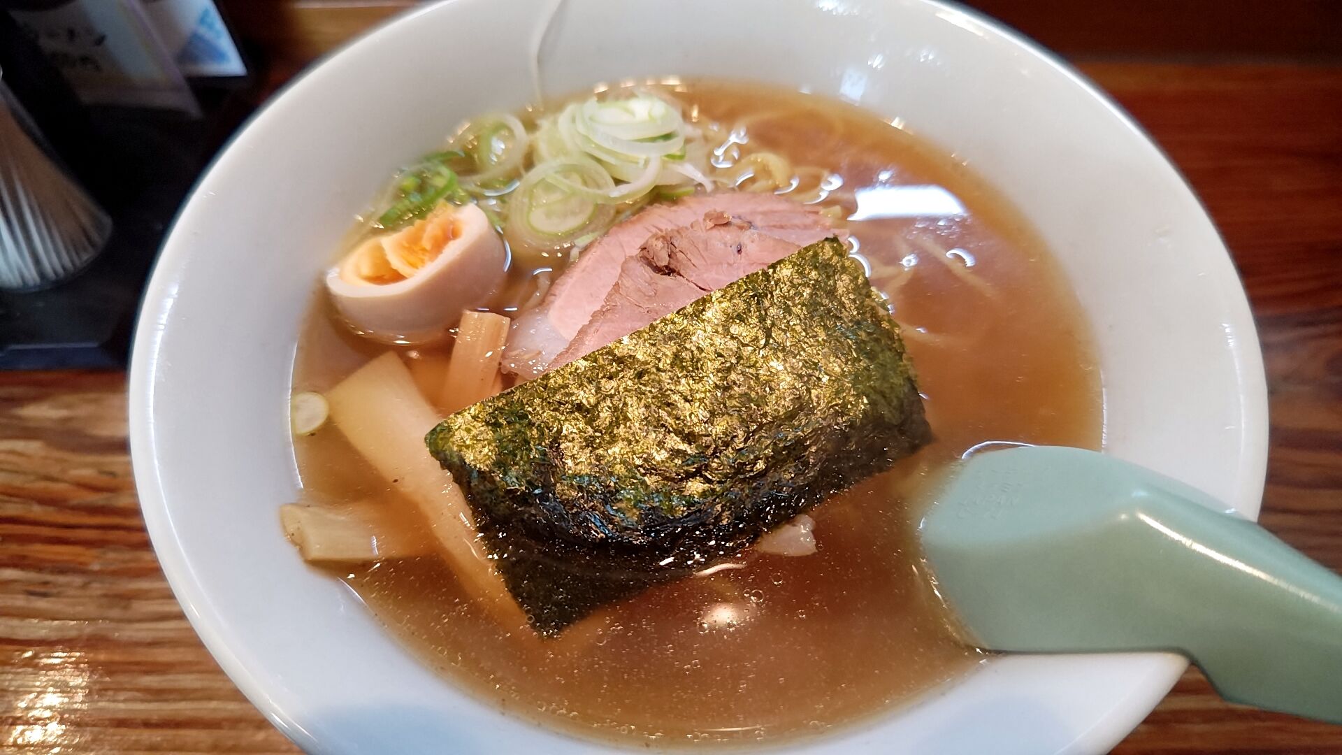 やや透き通ったスープにチャーシュー、海苔、長ネギ、メンマに茹で玉子!