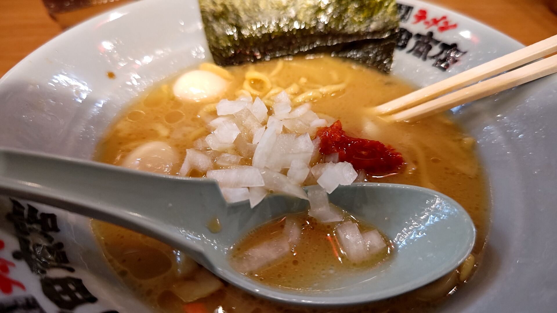 そして2/3程度食べたら更に味変に辛味噌と玉ねぎ!