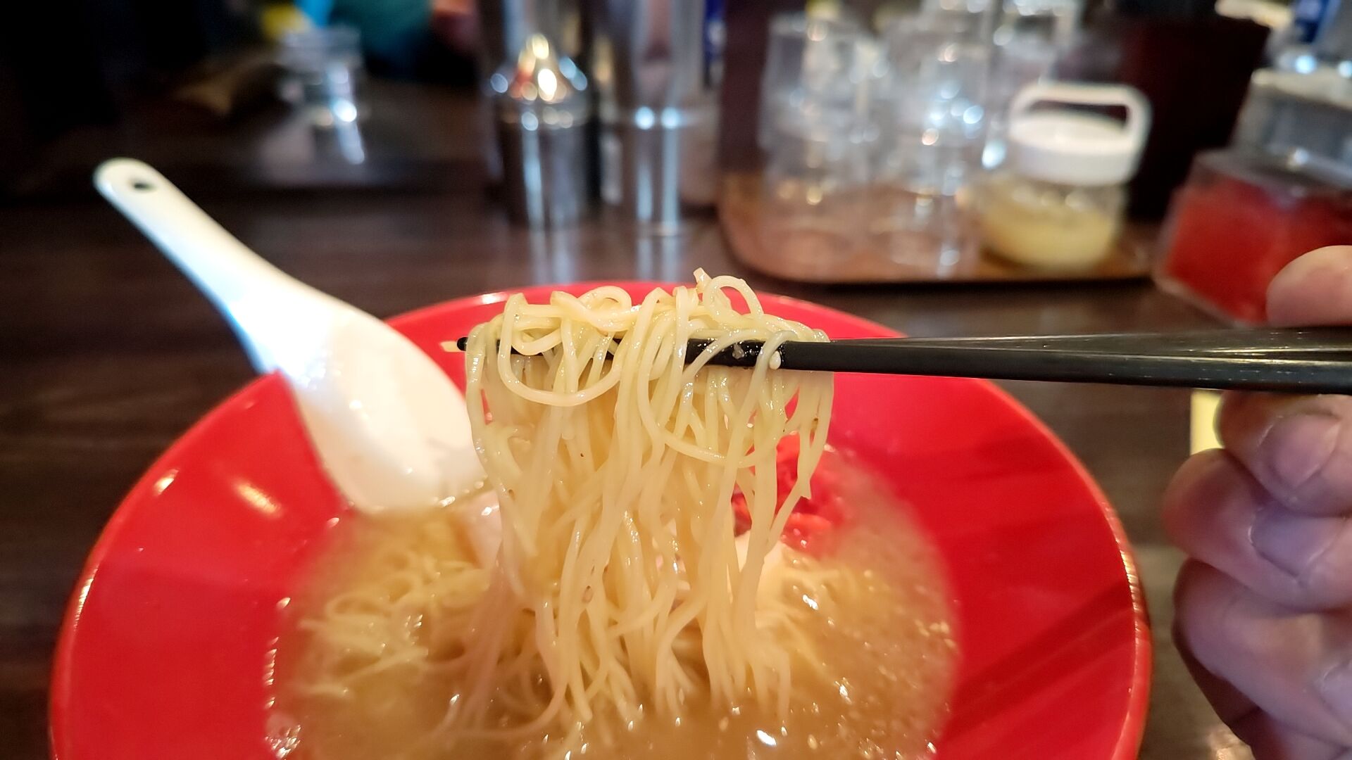 本場仕込の極細麺がスープを絡め取りうめぇ!