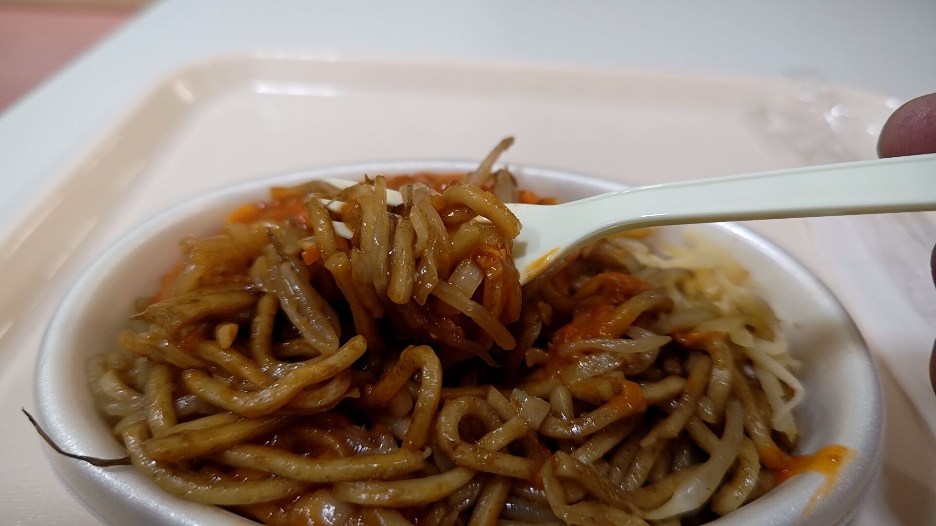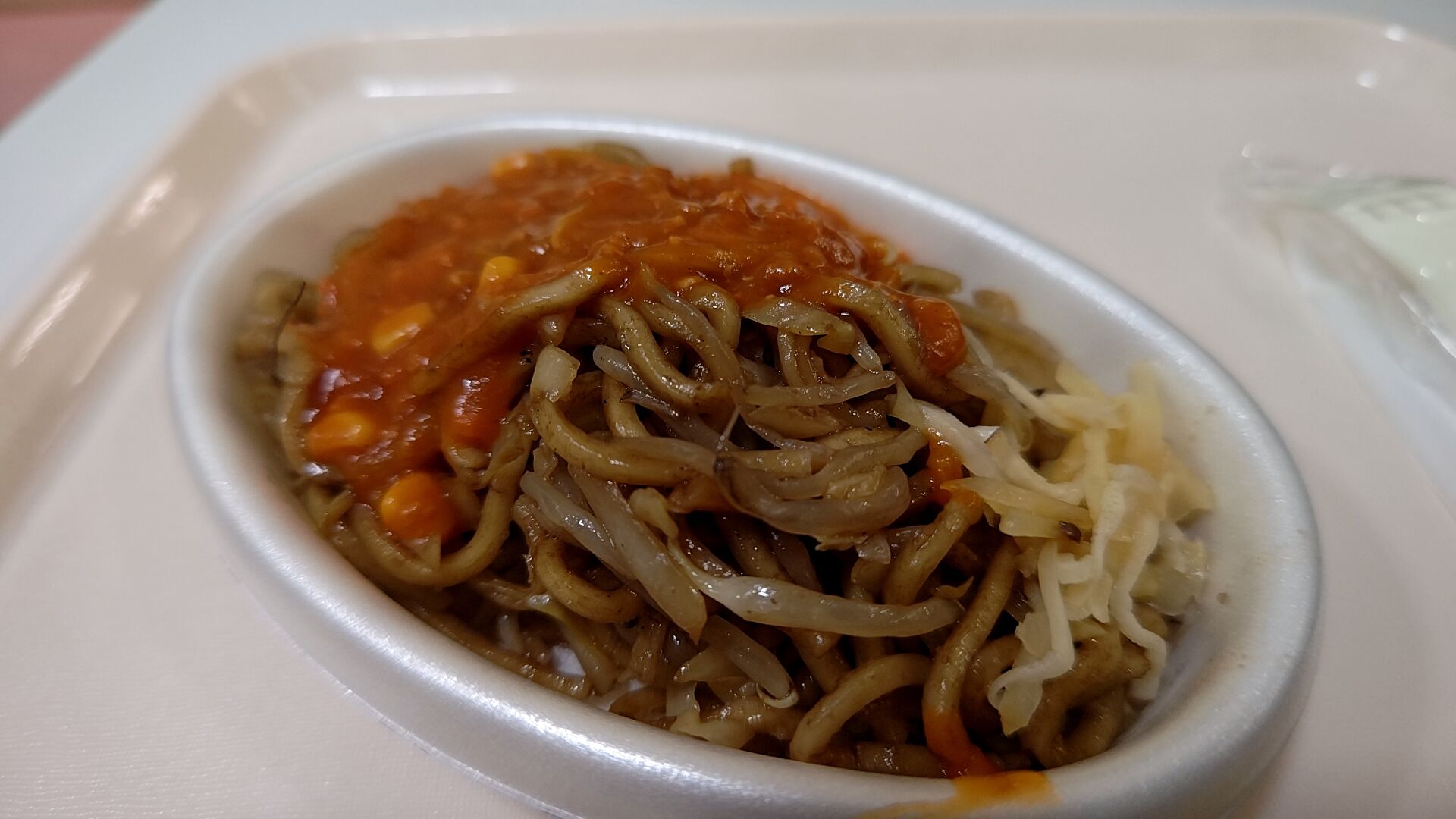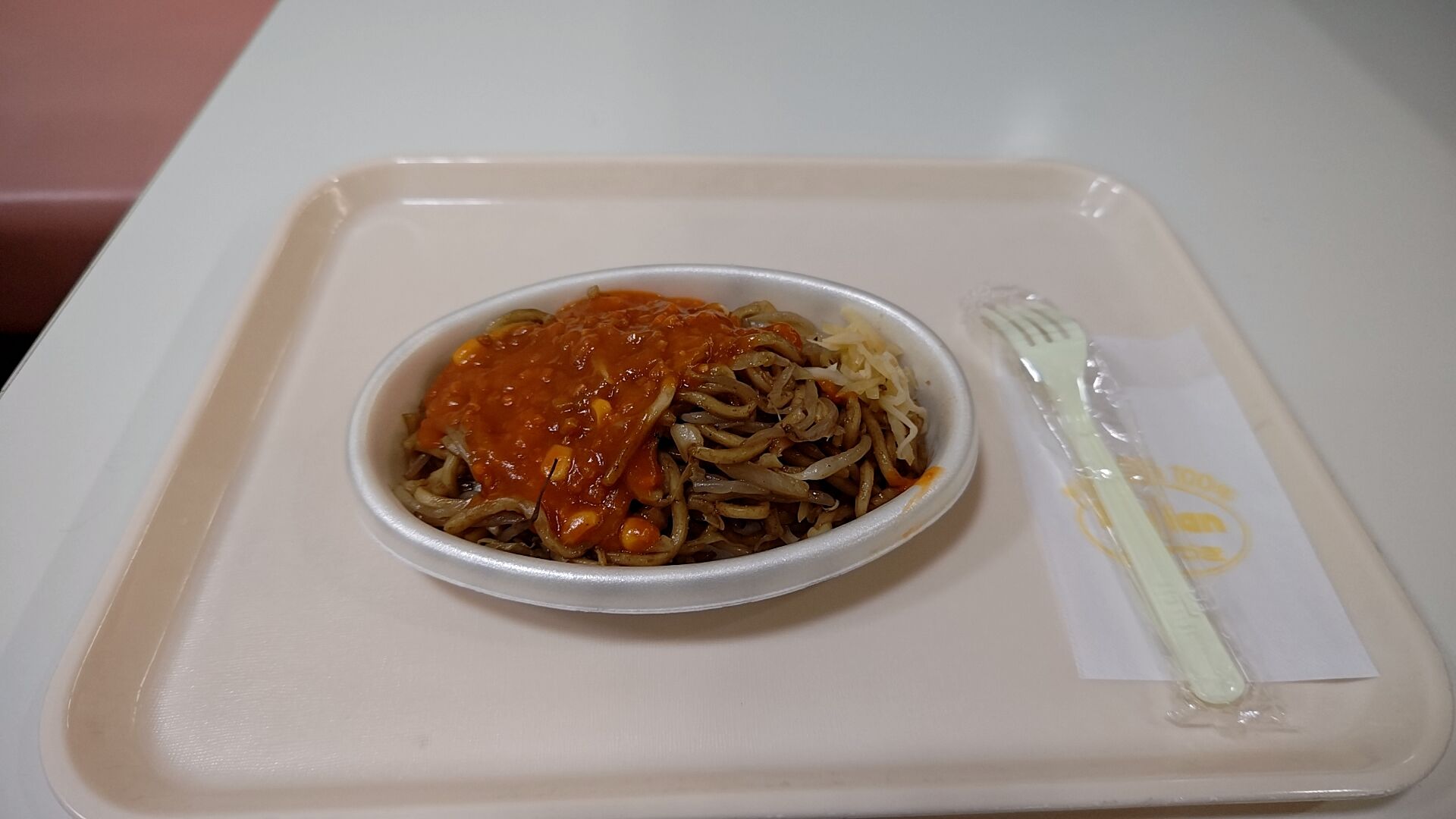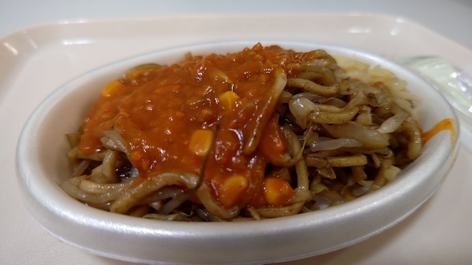 ざっくり言えば具がモヤシとキャベツの太麺の焼きそばにミートソースかけたみたいなモノで、付け合わせに生姜が付いてるのがポイント。