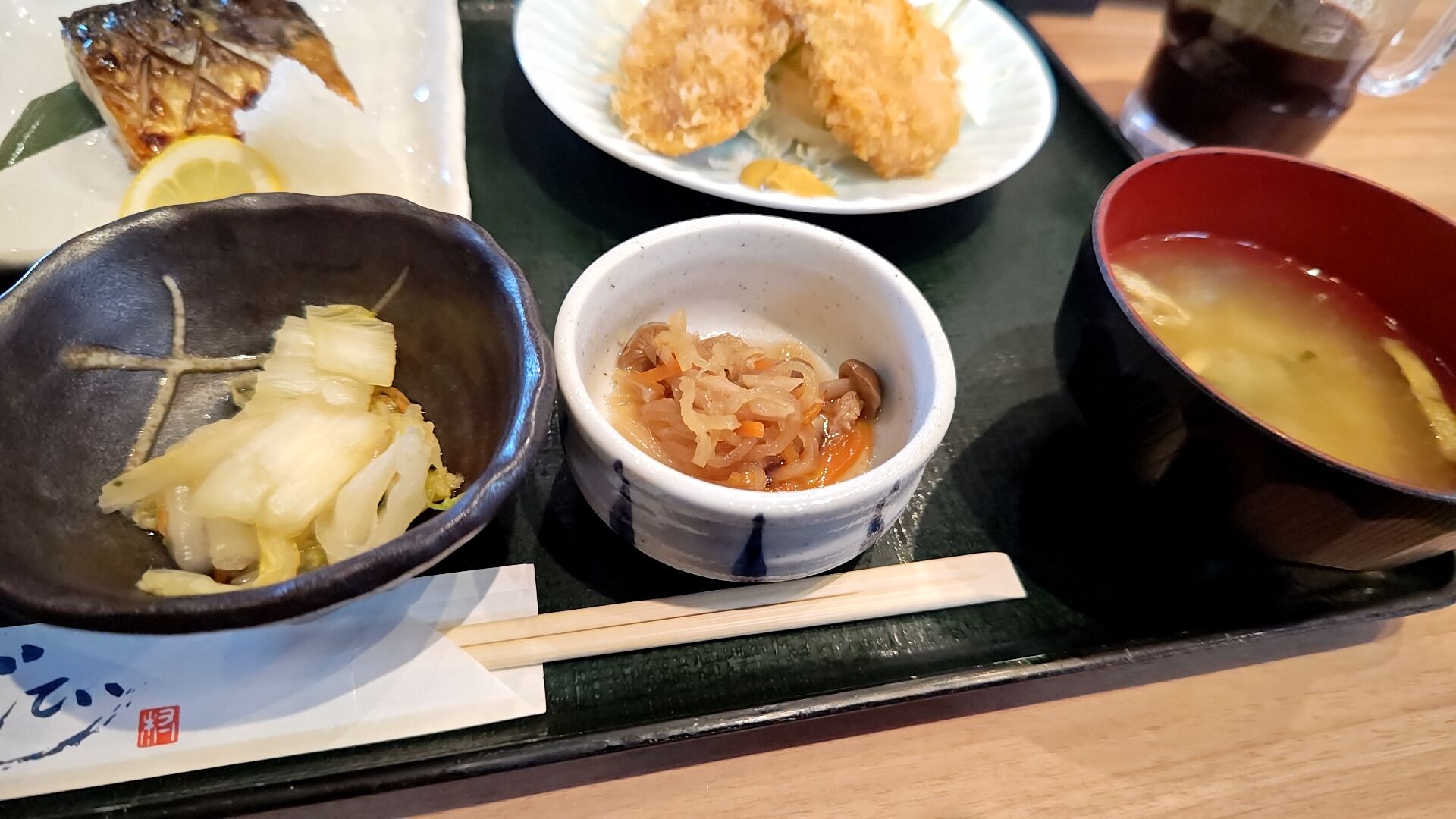 メインのおかずが二品に小鉢に味噌汁にほかほかご飯。