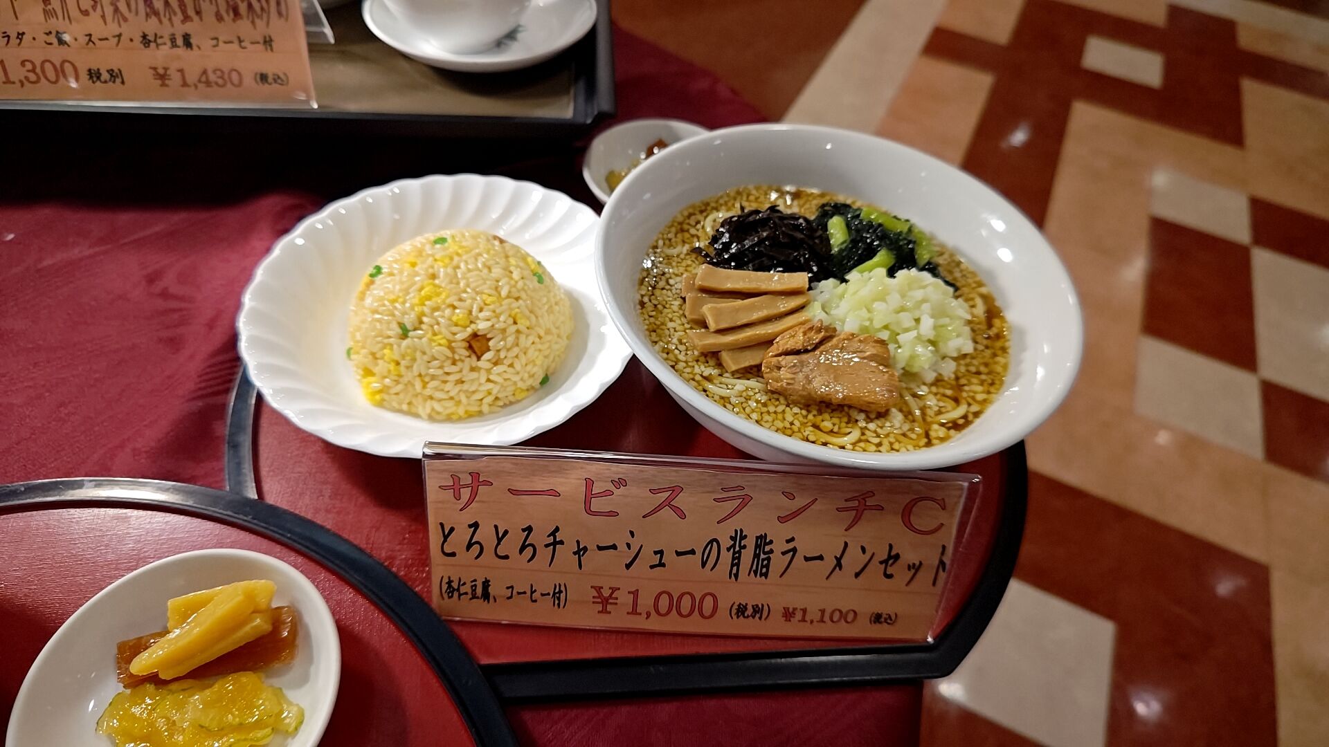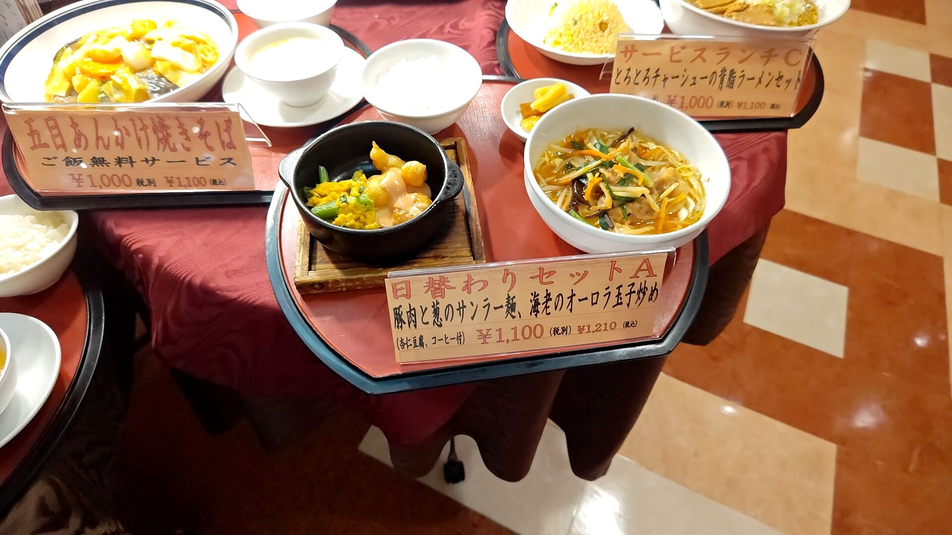 ご飯に付け合わせとデザートもついて税抜1100円か。