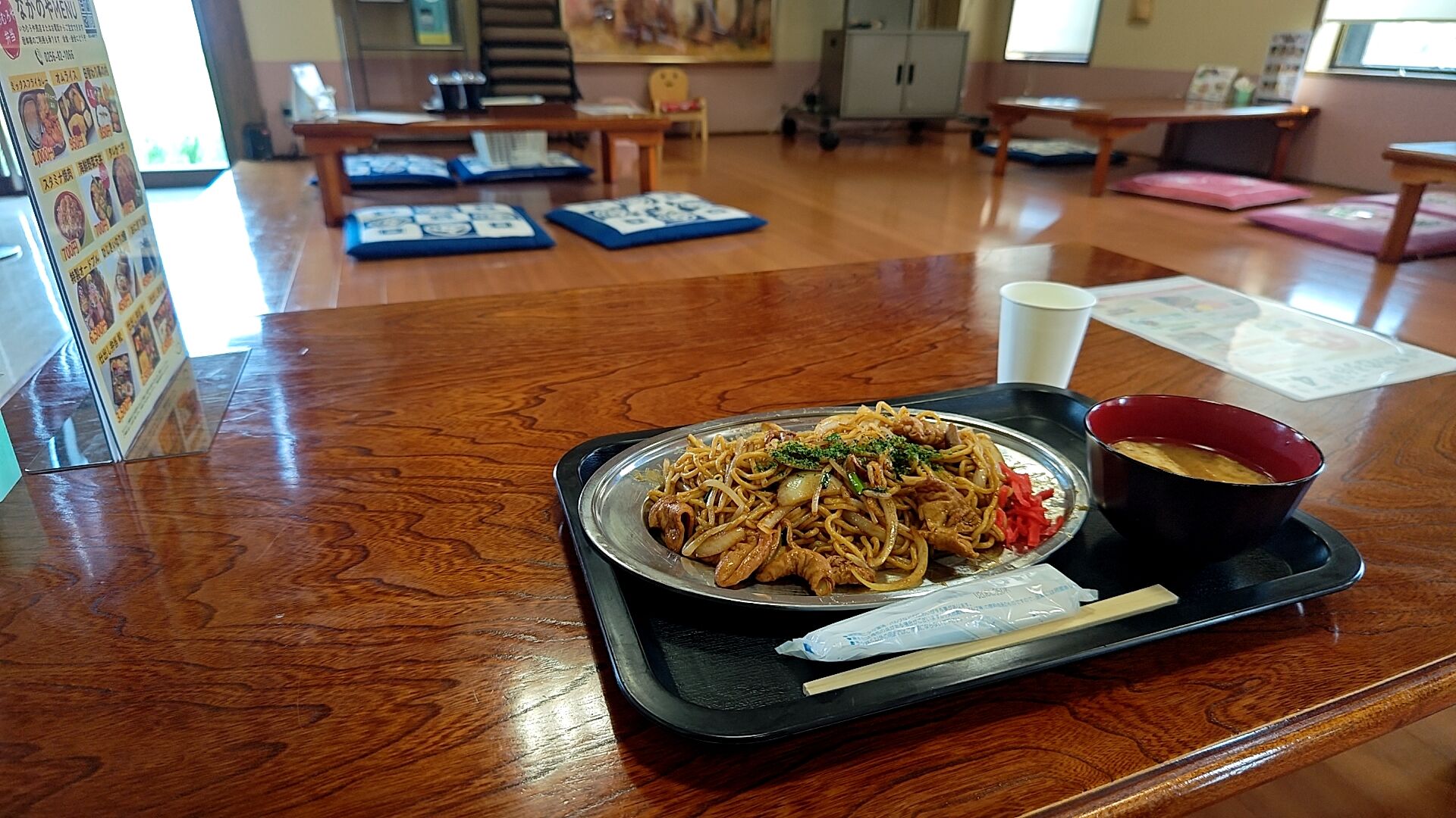 メインの焼きそばに味噌汁。