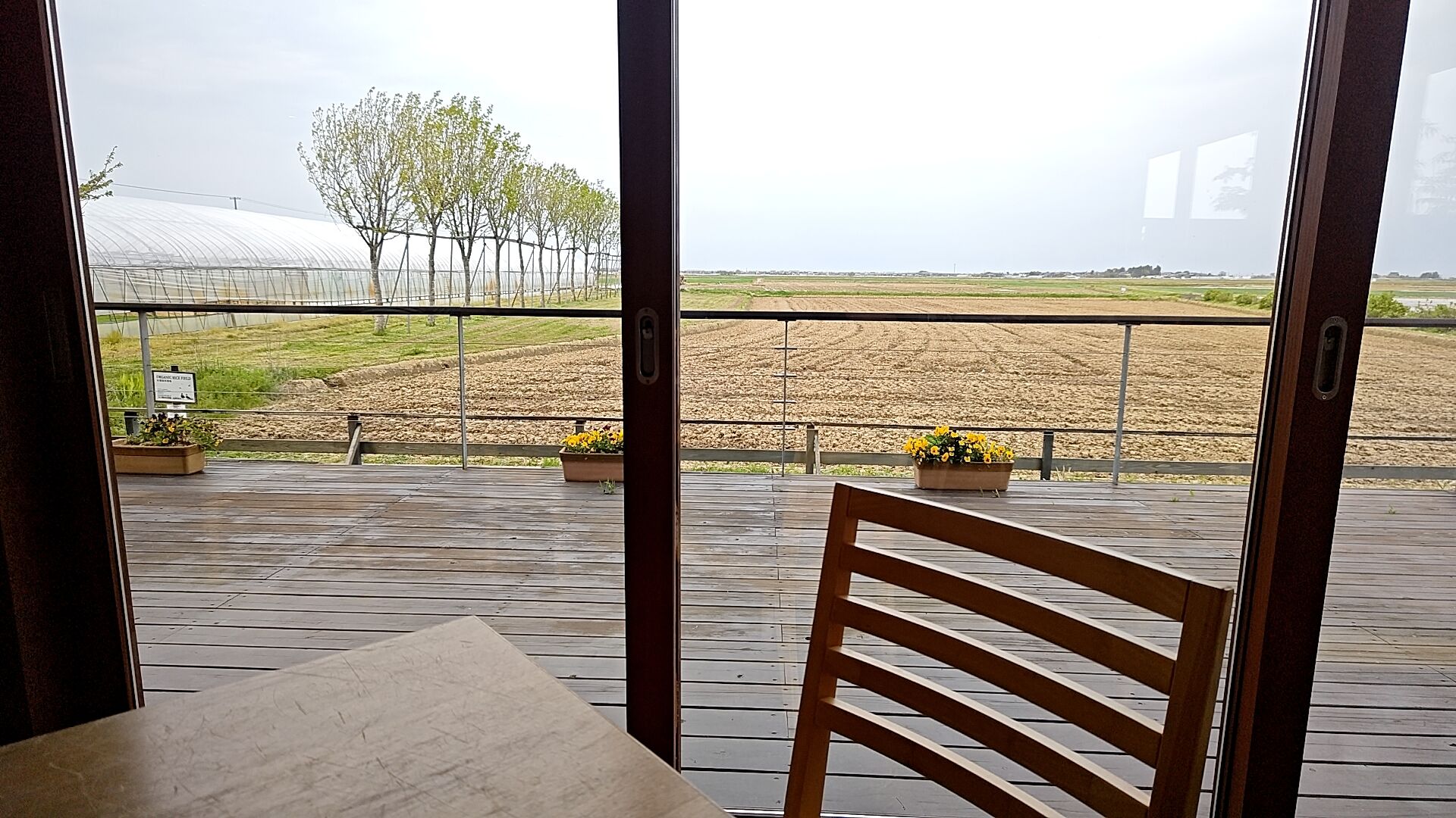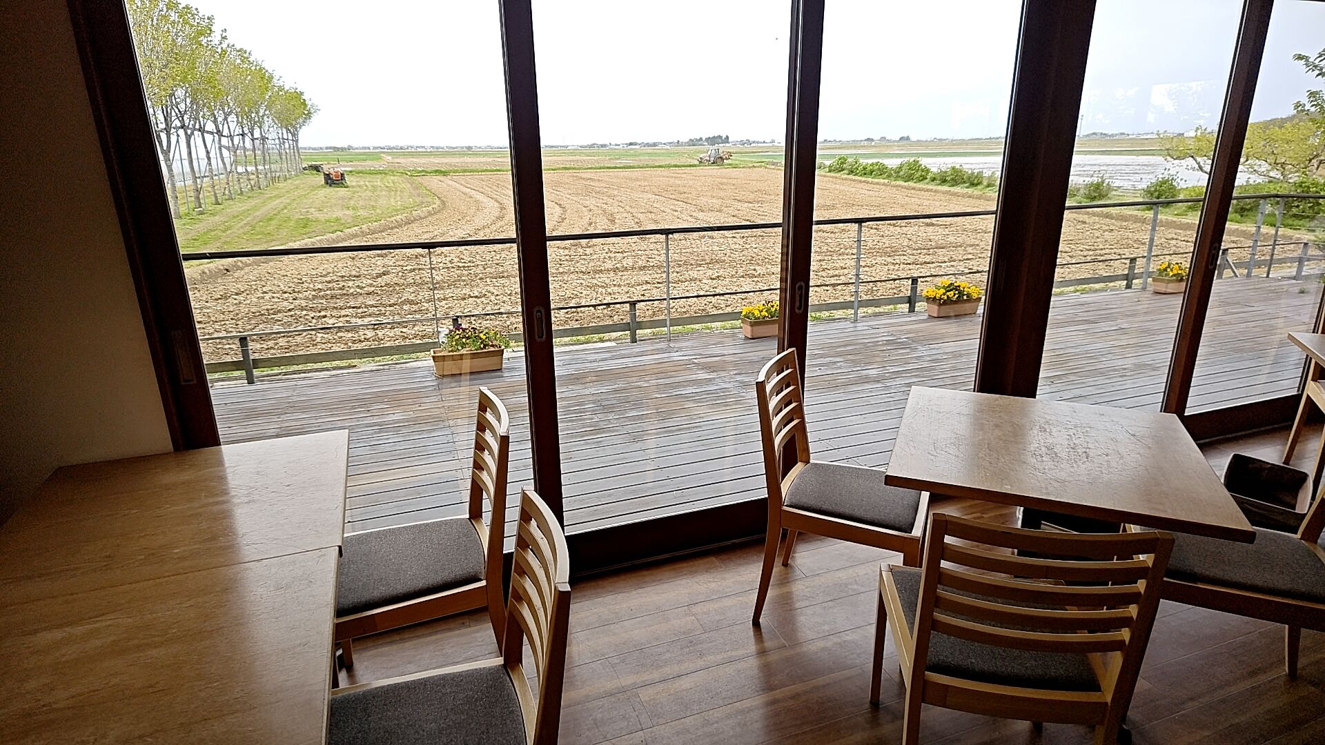 大きな窓から西蒲区の田園風景を望めるカフェ。