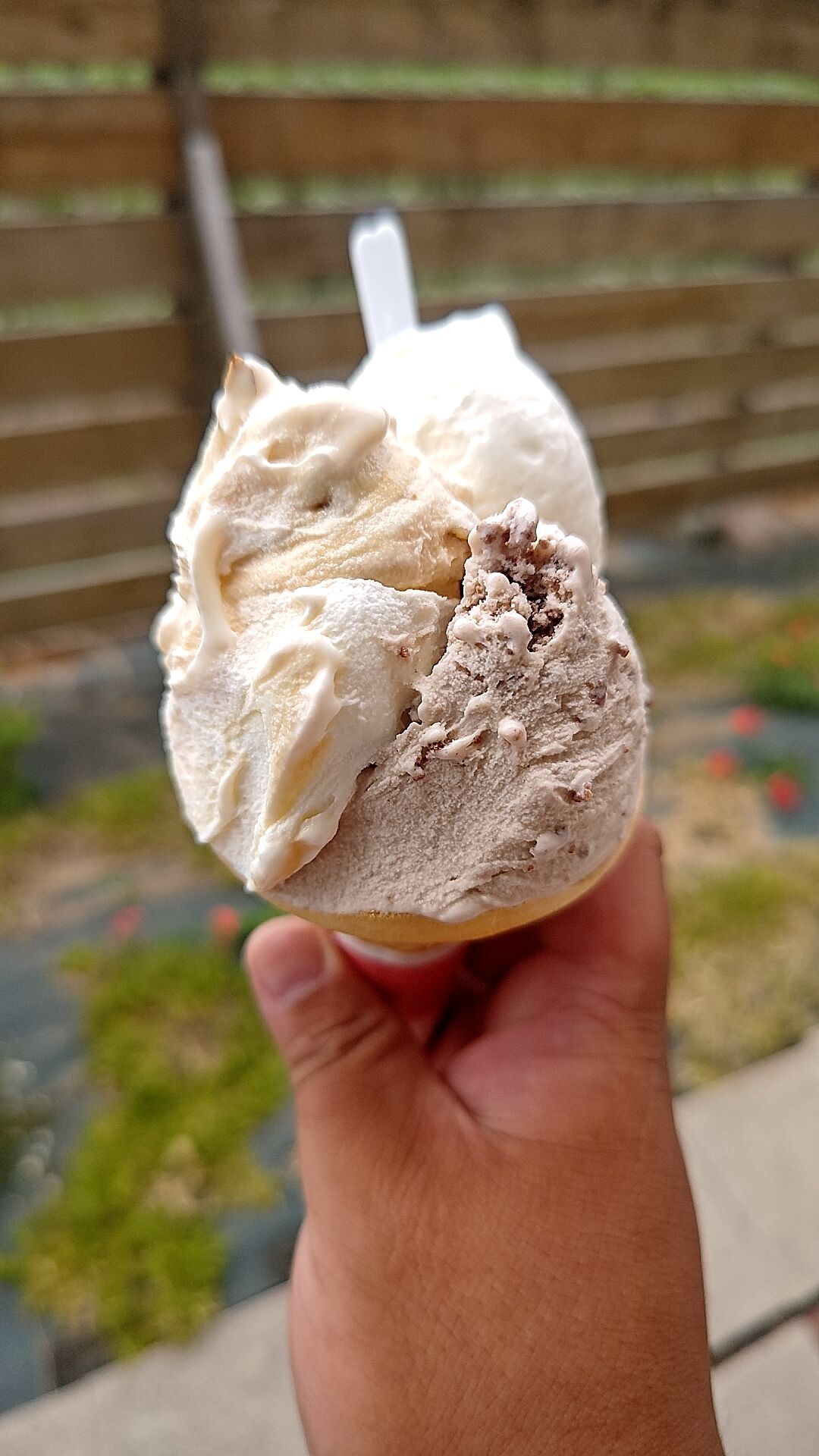 農園風景見ながら食いたいとこだが、多めに盛られたジェラートがガンガン溶ける気温なので