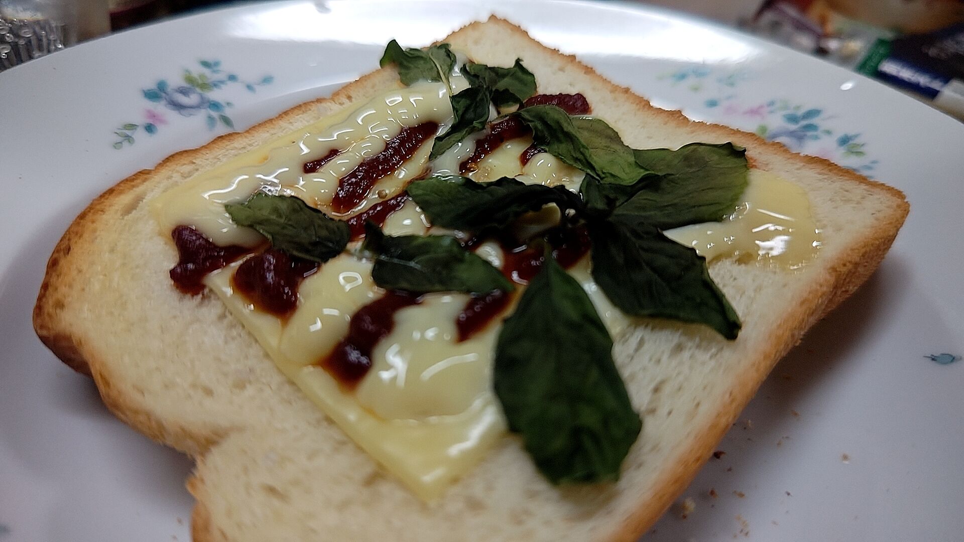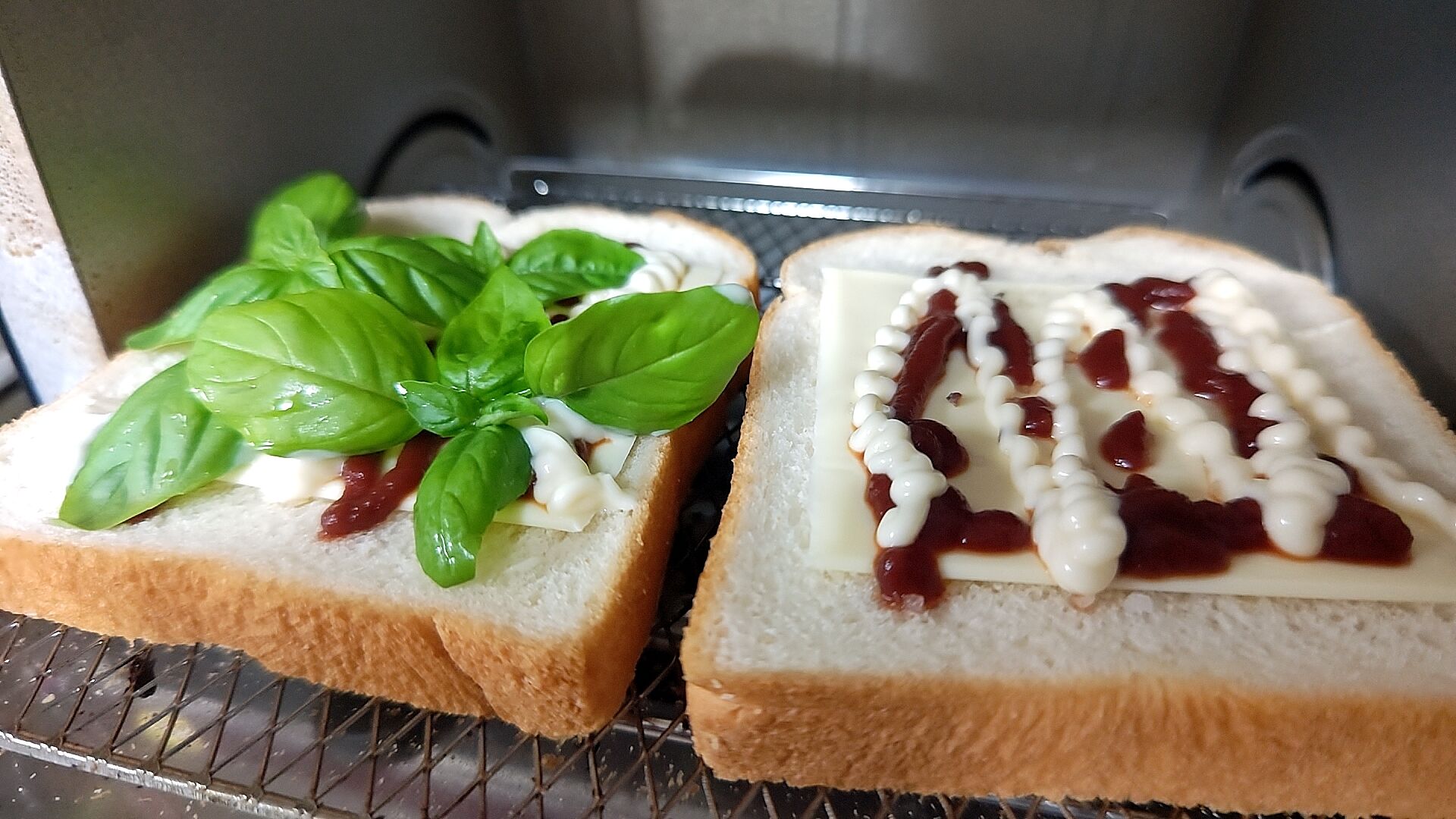 パンにチーズとケチャップ、少量のマヨネーズかけて