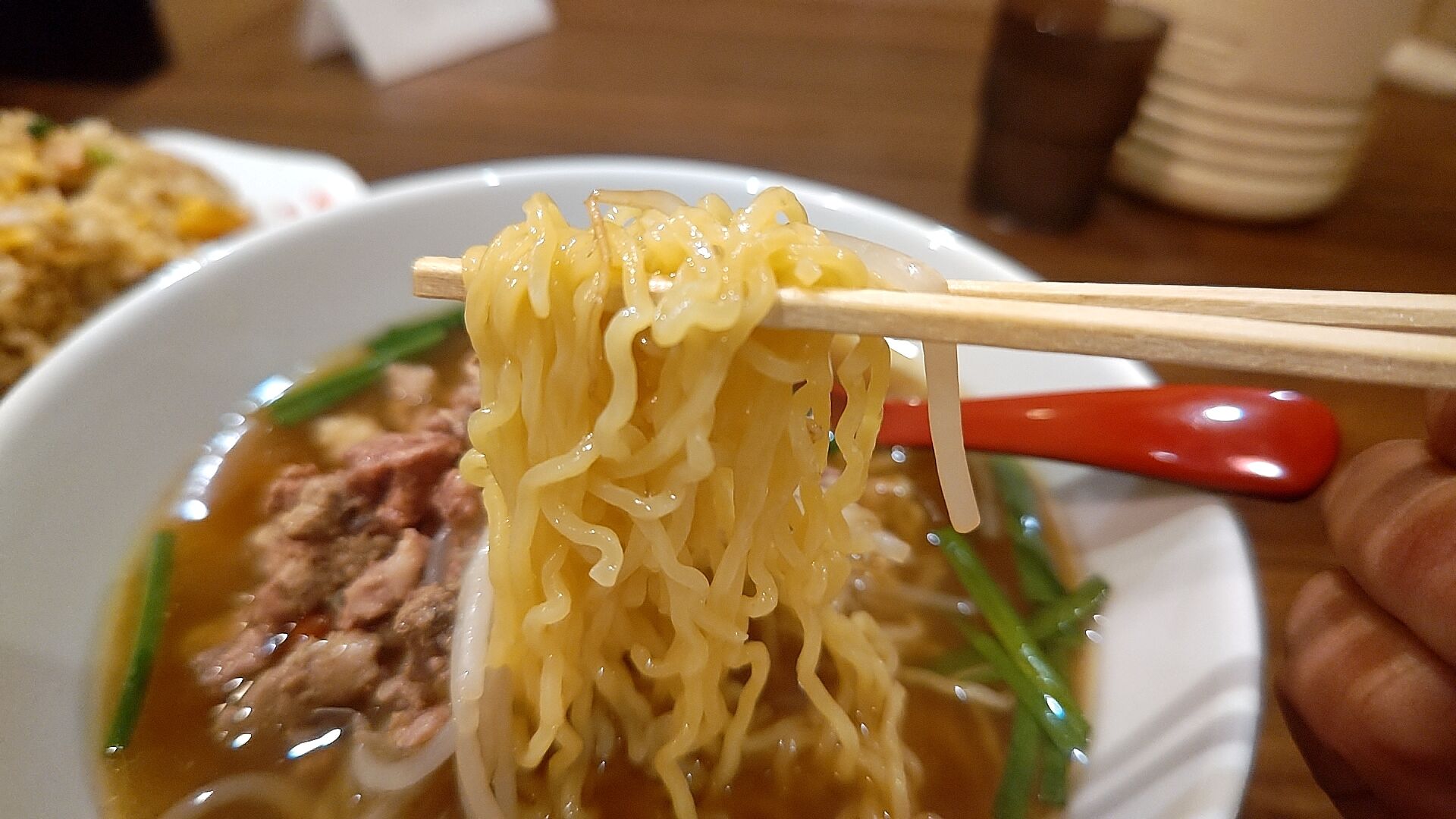 麺は縮れ麺の細麺でスープの旨味を絡め取る。