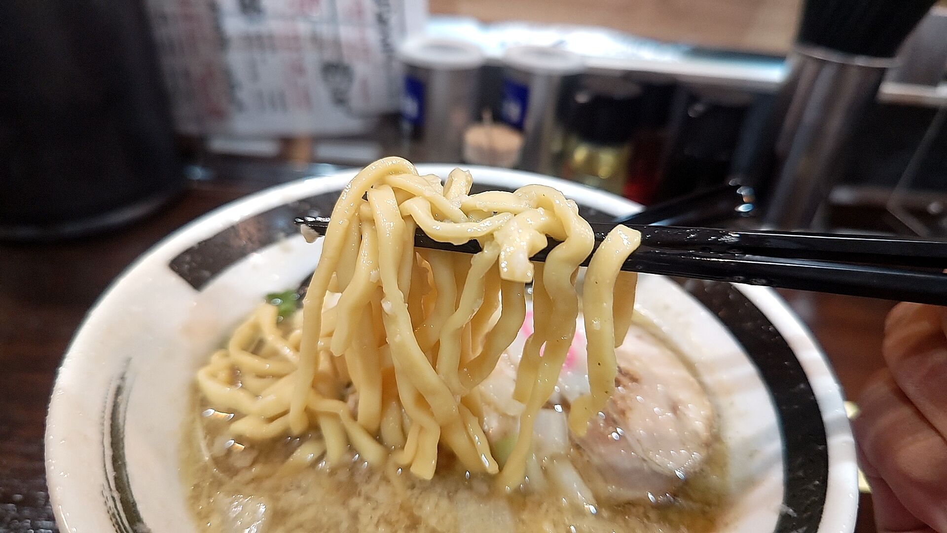 麺は不規則な縮れと長さの平打ち気味太麺で食べ応えアリ!