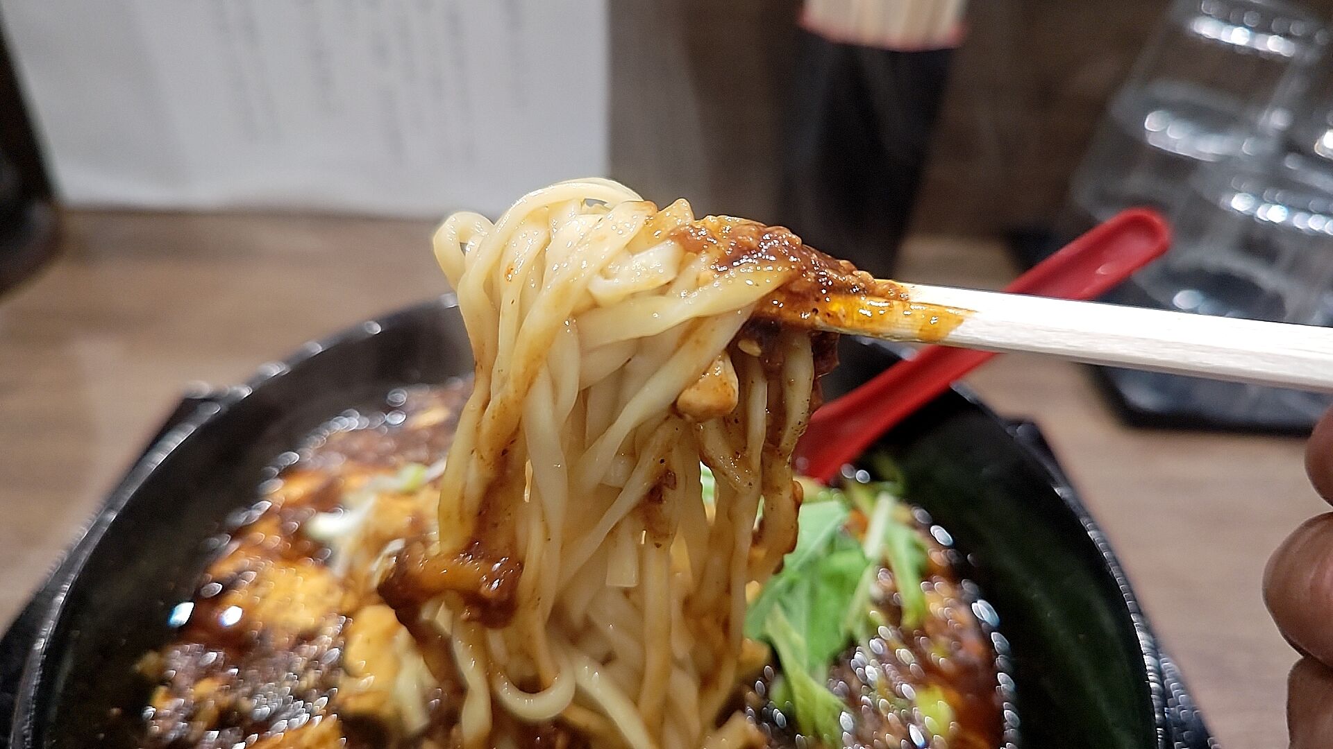麺は平打気味の太麺だから表面積広くてまた麻婆ガッツリ絡んでシビ辛旨!