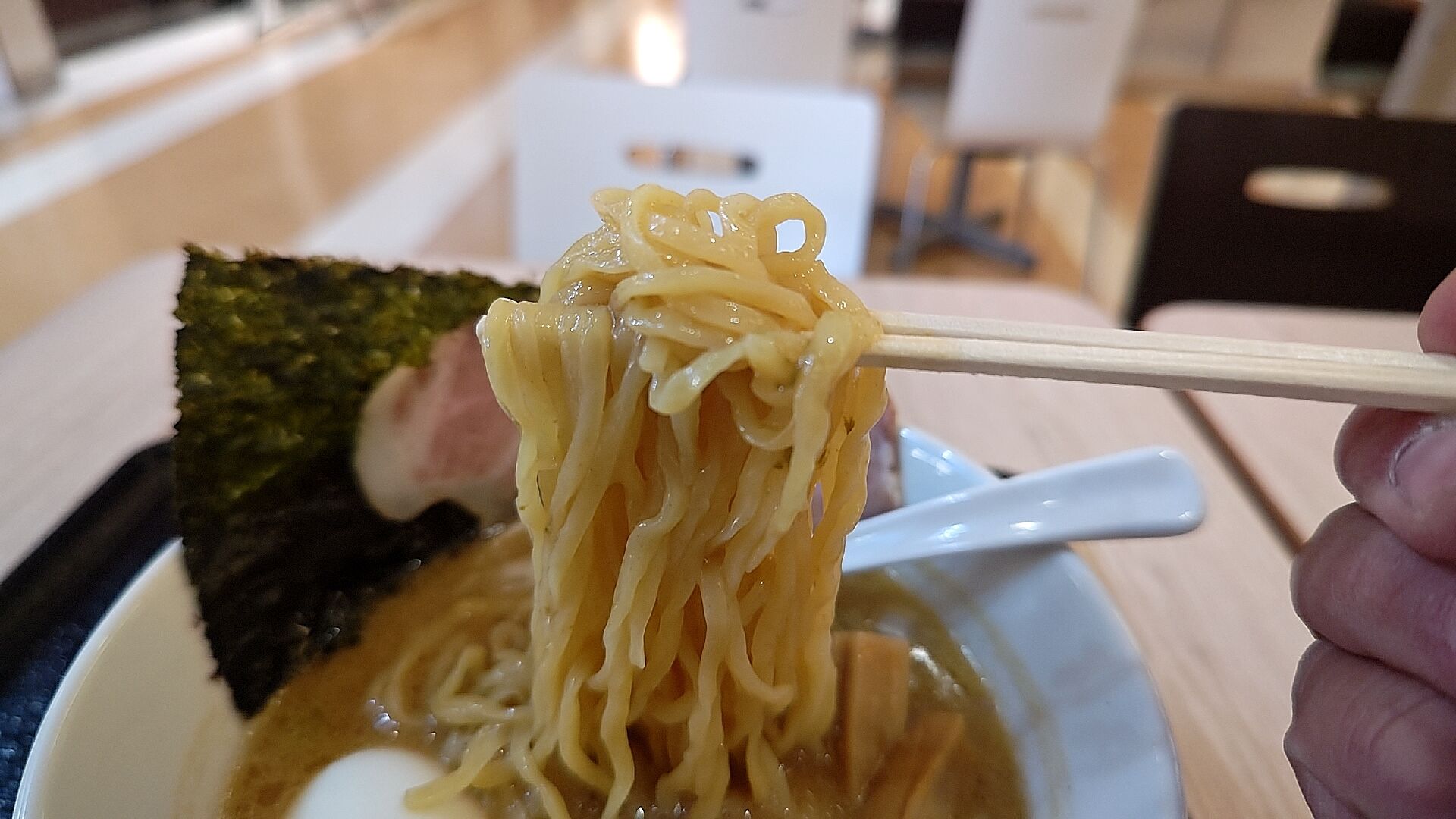 麺はつるモチの平打ち気味の太麺。