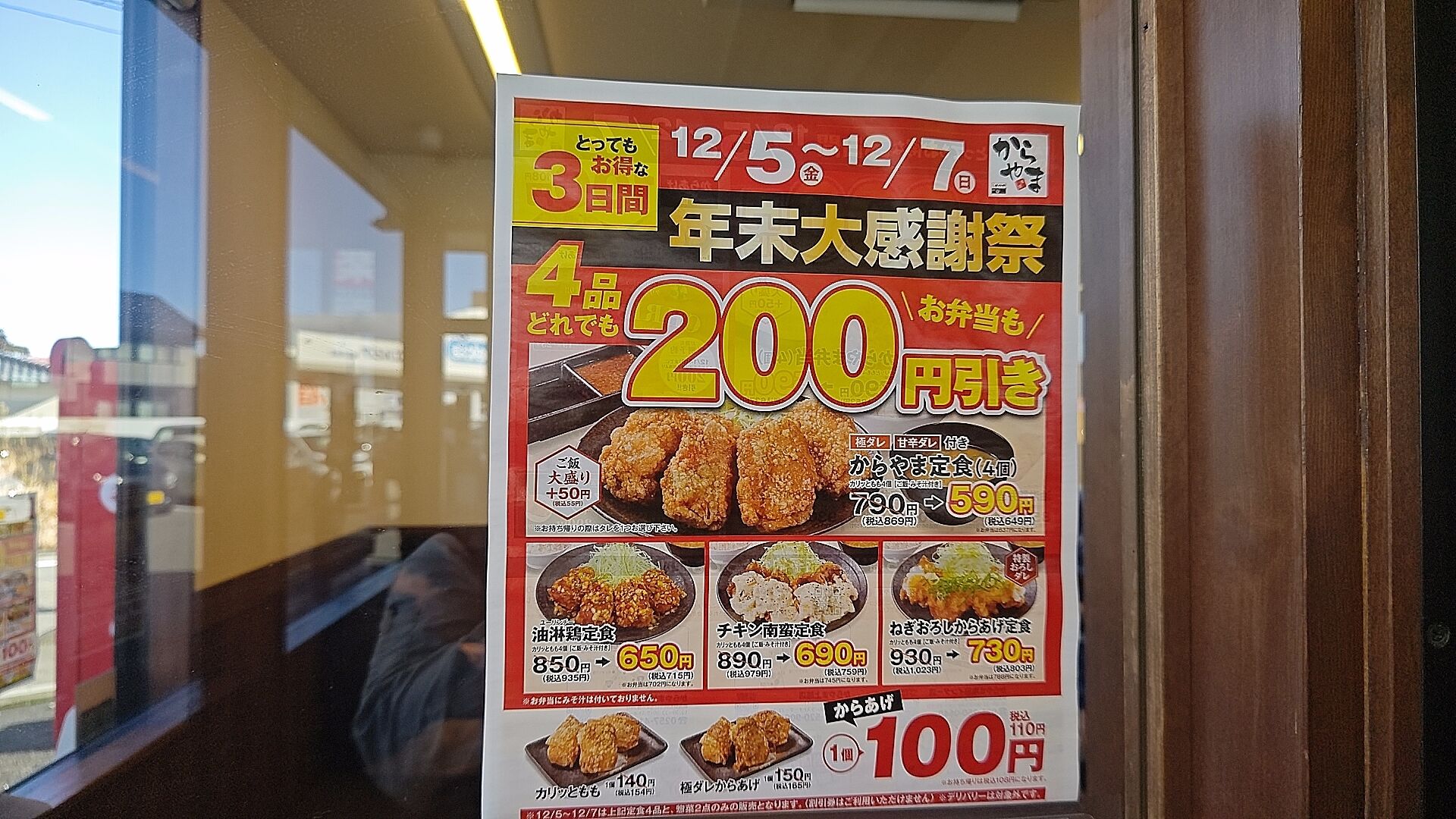 アークランドサービスの運営する外食チェーン店「からやま」の年末大感謝祭で主要4品の定食が200円引き!