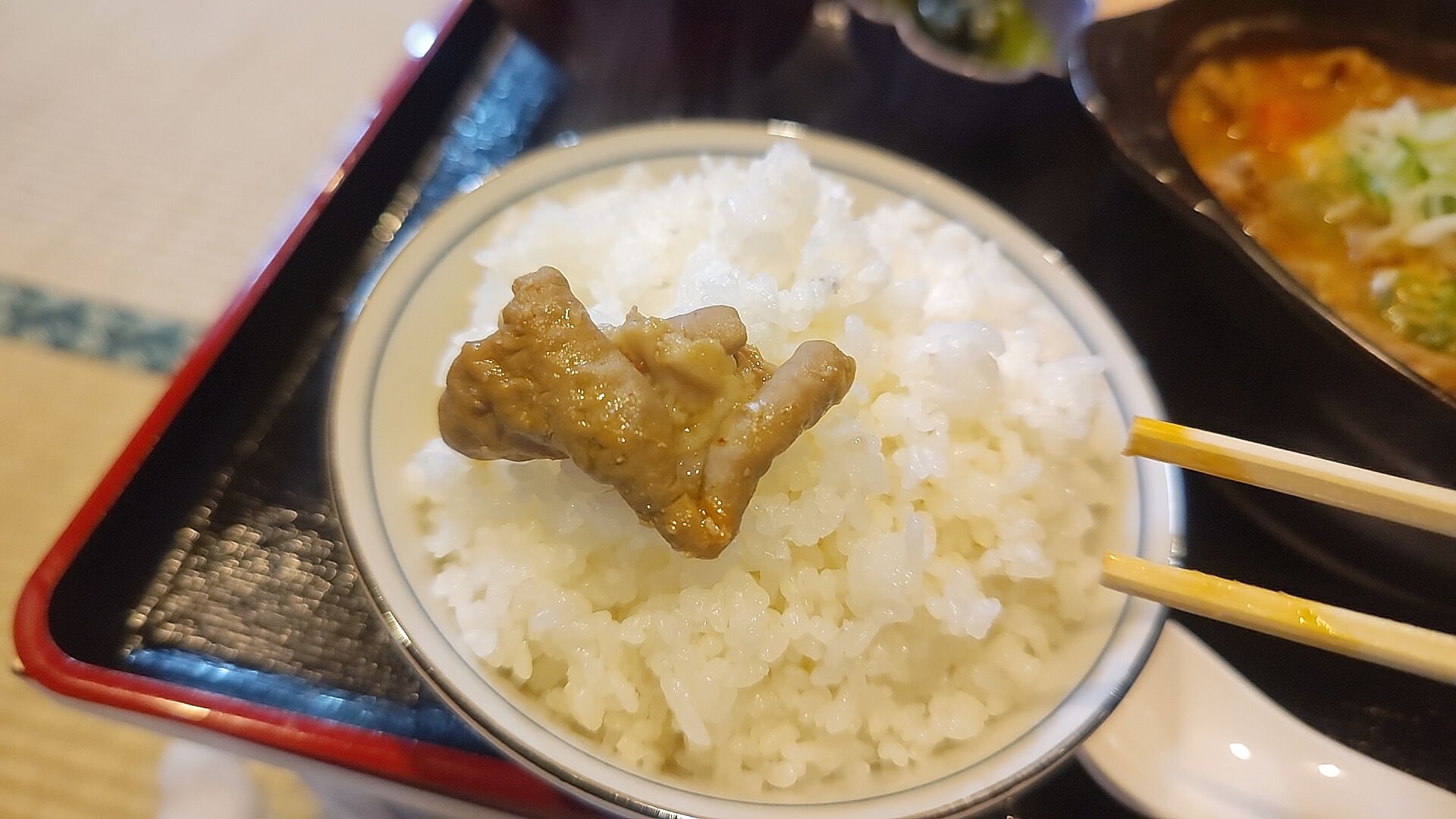 プルプルと柔らかく煮えたもつ煮をオン・ザ・ライス!