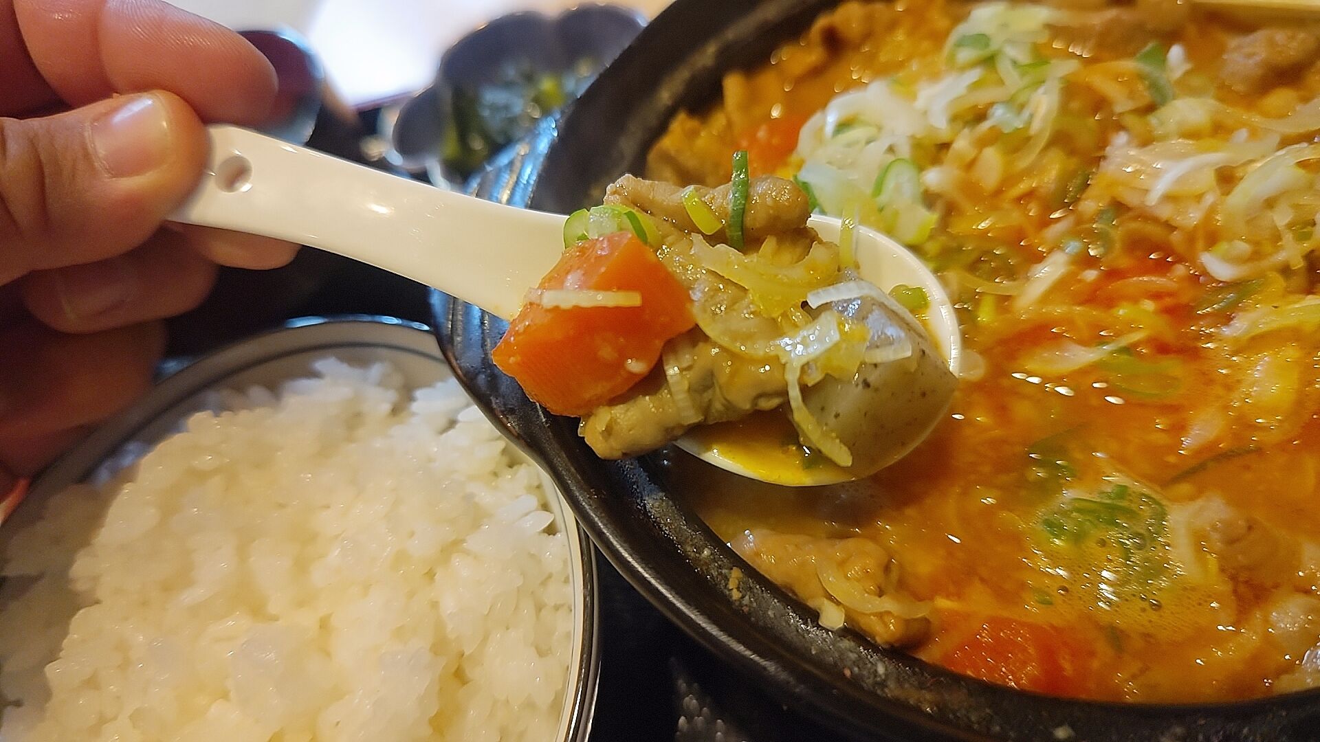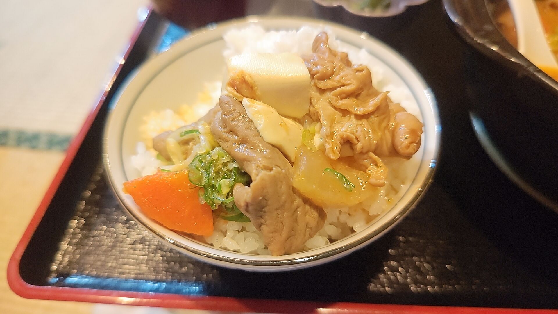ええい!もっとだ!!とニンジン、ネギ、大根に豆腐もまとめてオン・ザ・ライスでかきこむ!