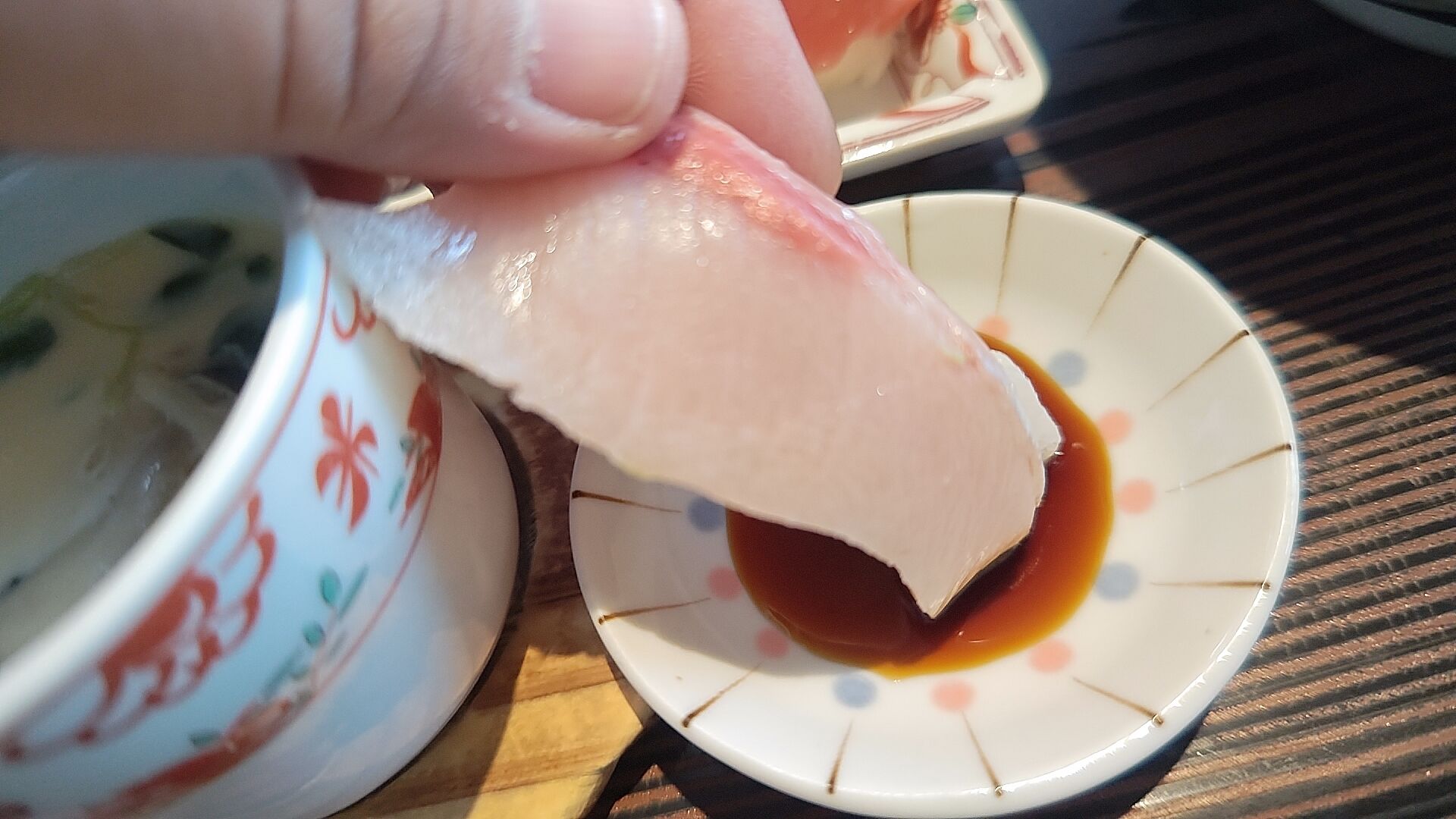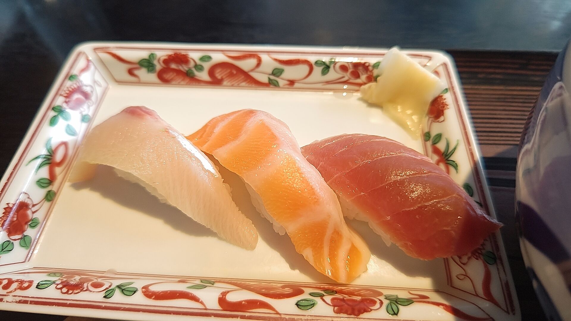 寿司3貫はまたブリ・サーモン・マグロと人気の高いヤツで、ブリとか凄い新鮮で脂の乗りが良さそうなとこだ。