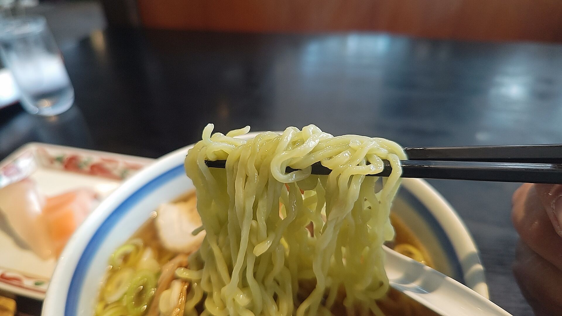 淡く緑色でコシのある縮れ麺。