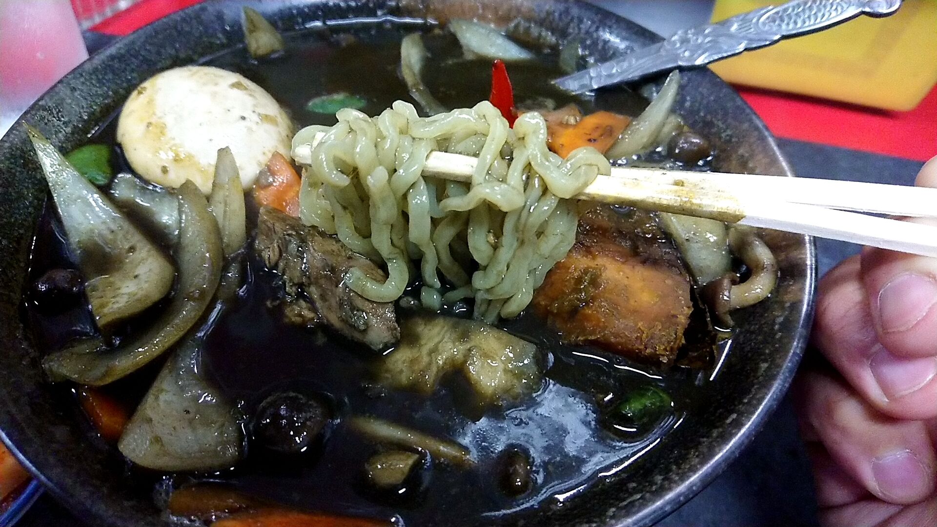 玉葱・ニンジン・ジャガイモや肉などカレー定番の具の他にキノコ類や半熟煮卵などの具がザクザクゴロゴロと入った辛くて黒いカレーラーメンです。
