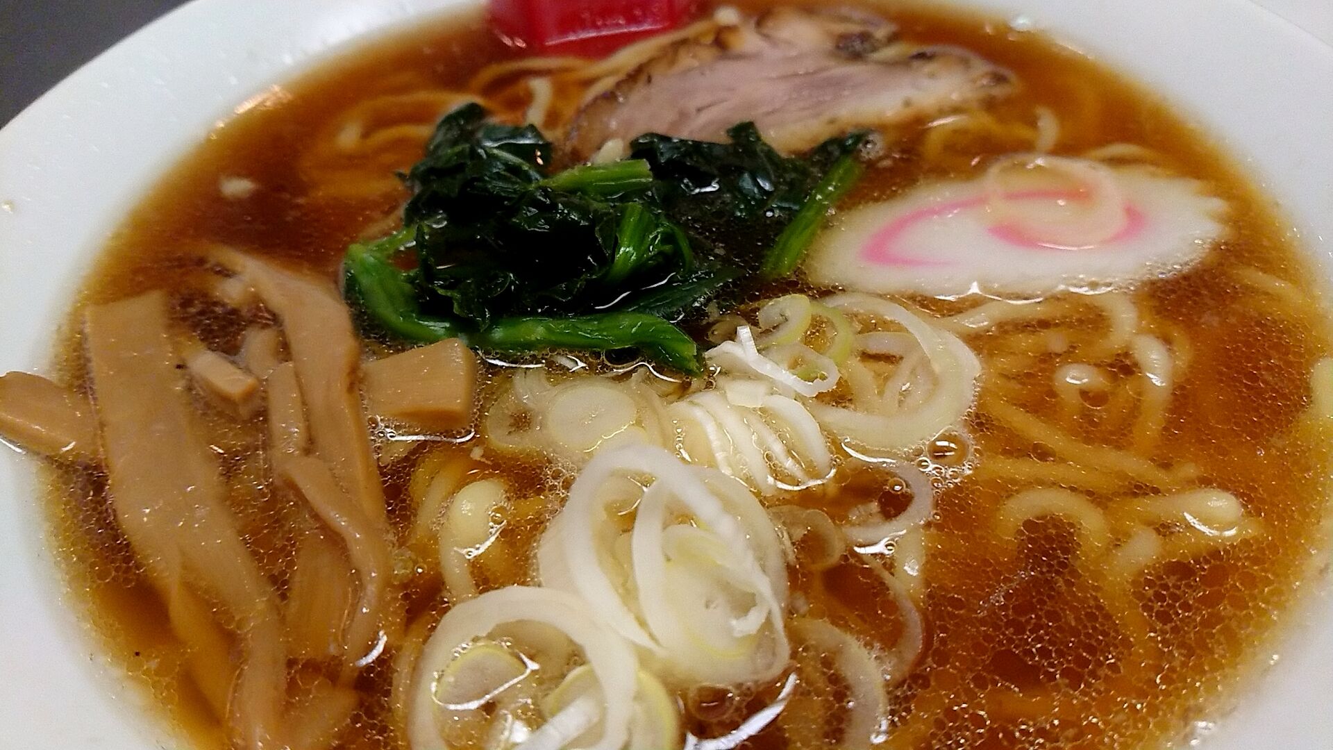 ネギ・メンマ・ほうれん草・ぐるぐるナルト・チャーシューに透明度のある醤油スープ。
