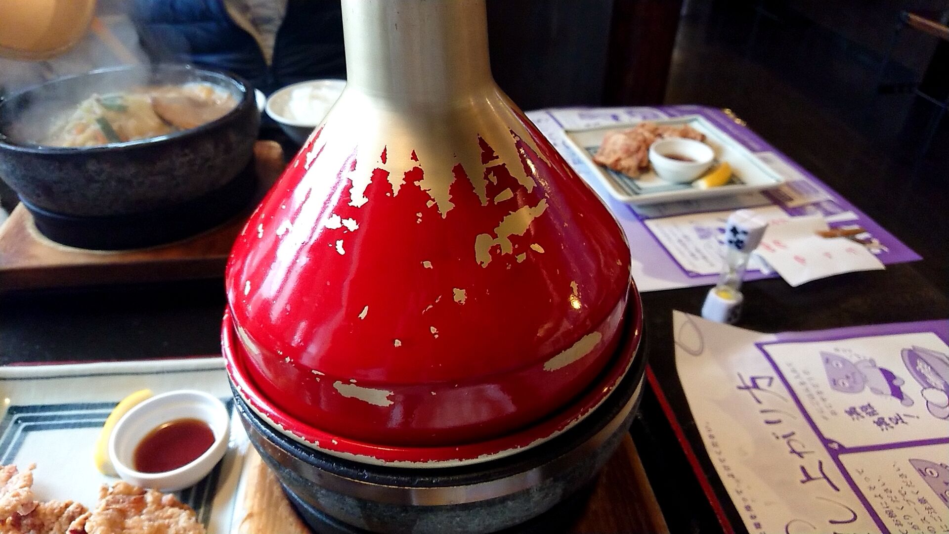 アツアツに熱せられて店員さんが目の前でスープを注ぐので、跳ね防止の為にカバーがかけられます。