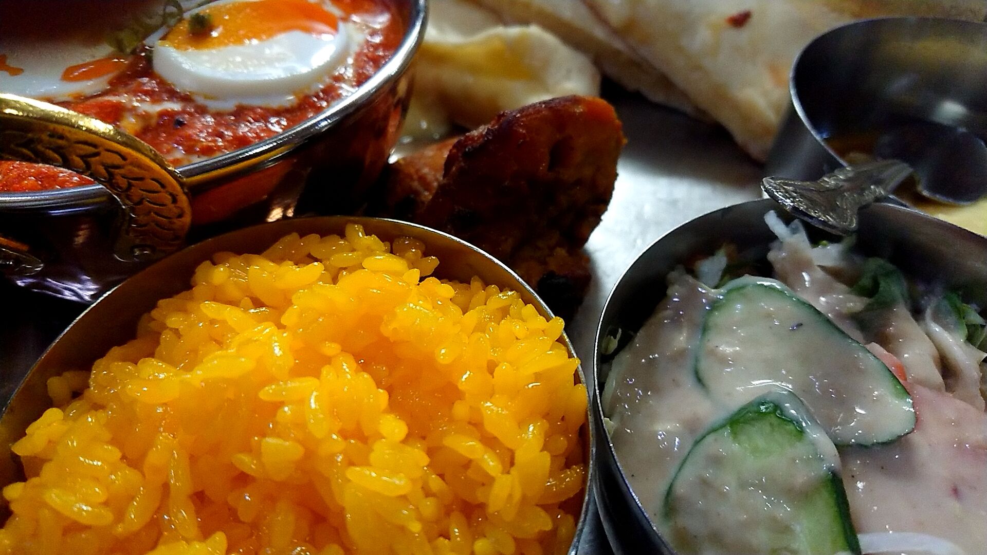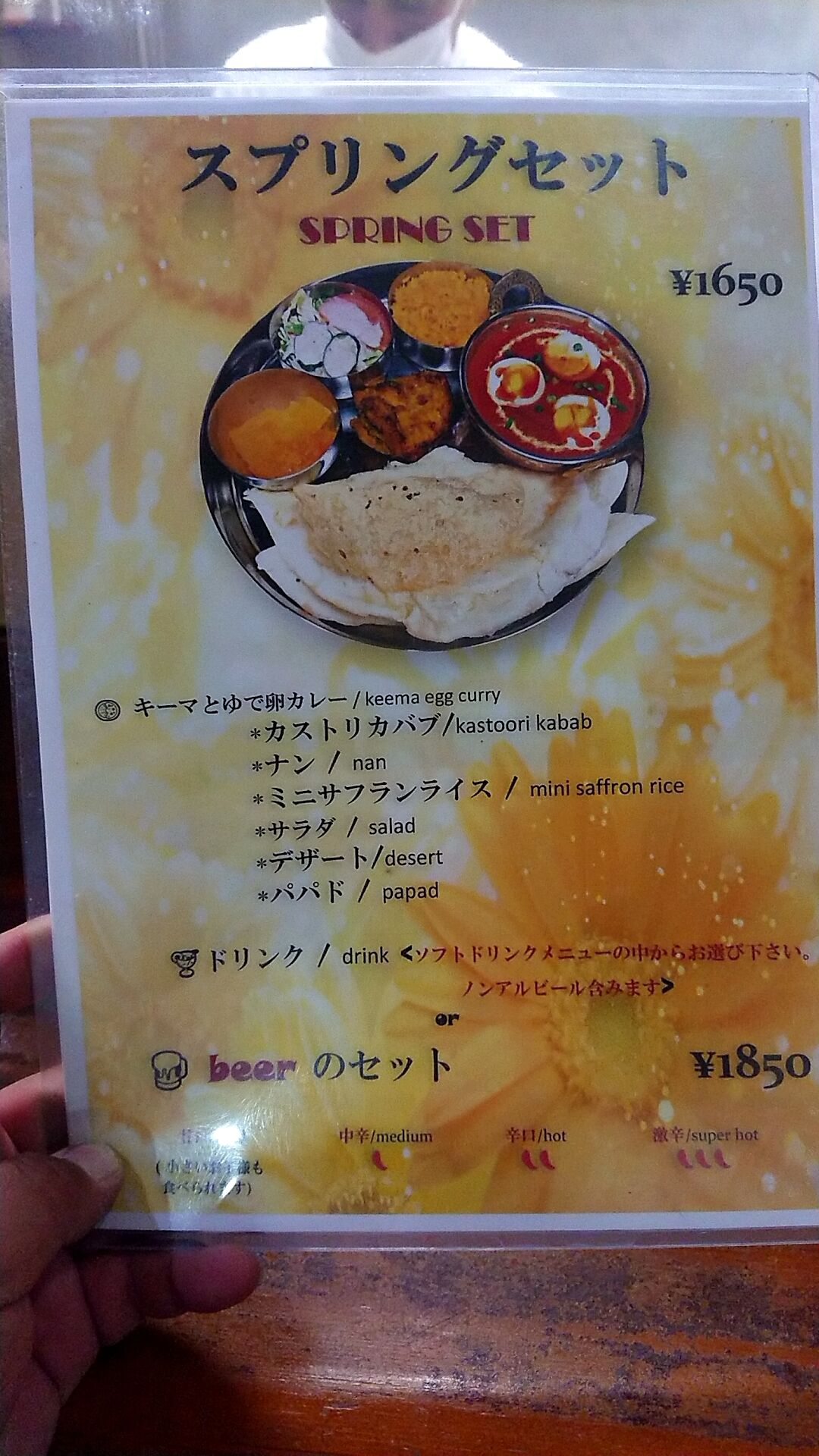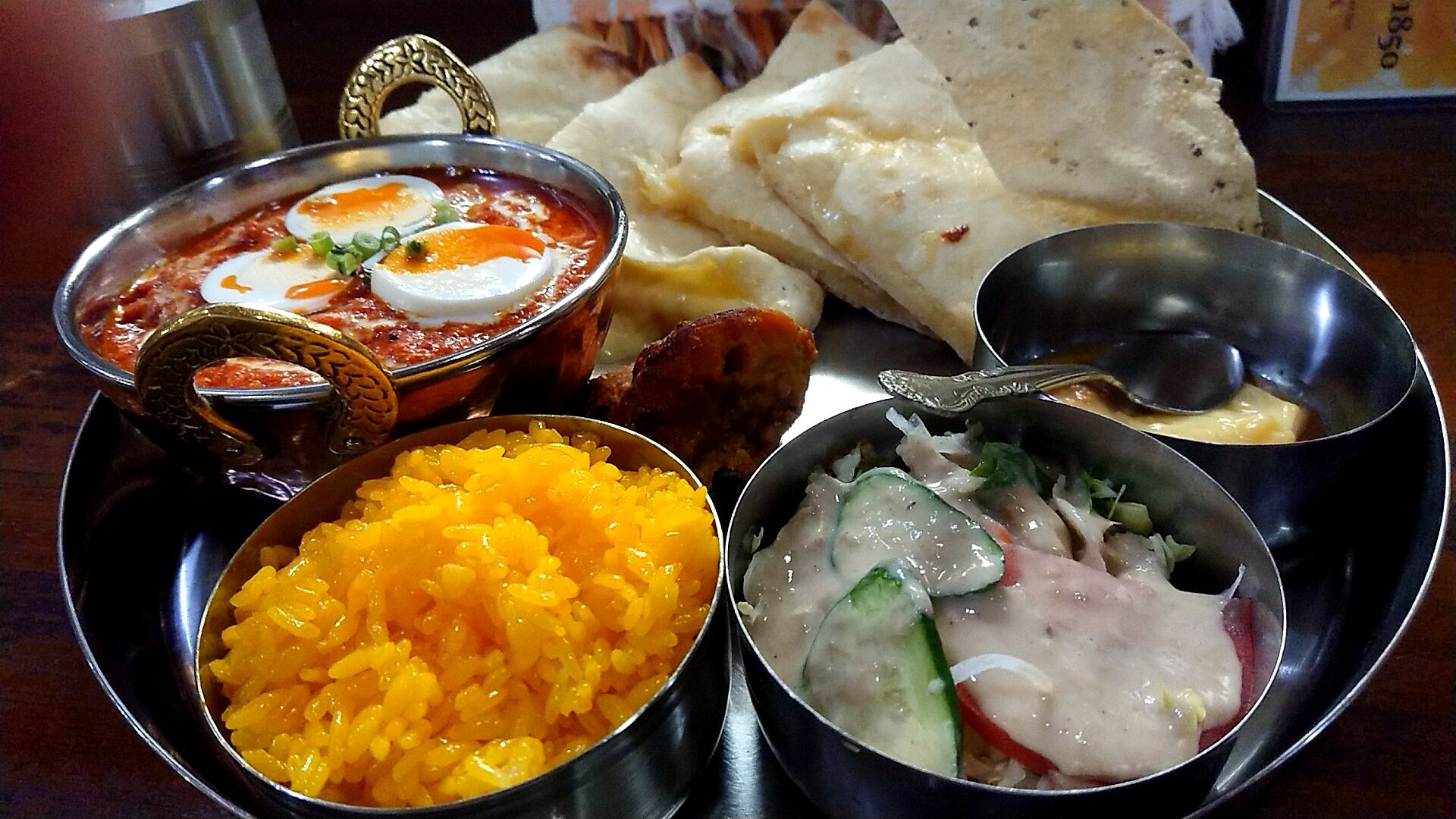 キーマとゆで玉子のカレーにカストリカバブ、サラダ、サフランライス、ナン(ほぼいつも+100円でチーズナンに変える)パパド、デザートとドリンクのラッシーのよくばりセット!!